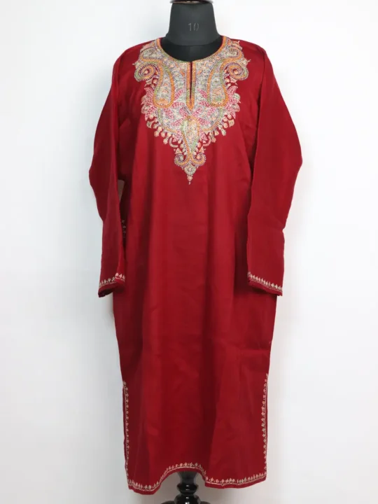 This traditional maroon pheran is made from soft, warm Raffal wool for winter. It features multicolored Hand Sozni embroidery around the neckline and it includes pockets both side for everyday use.