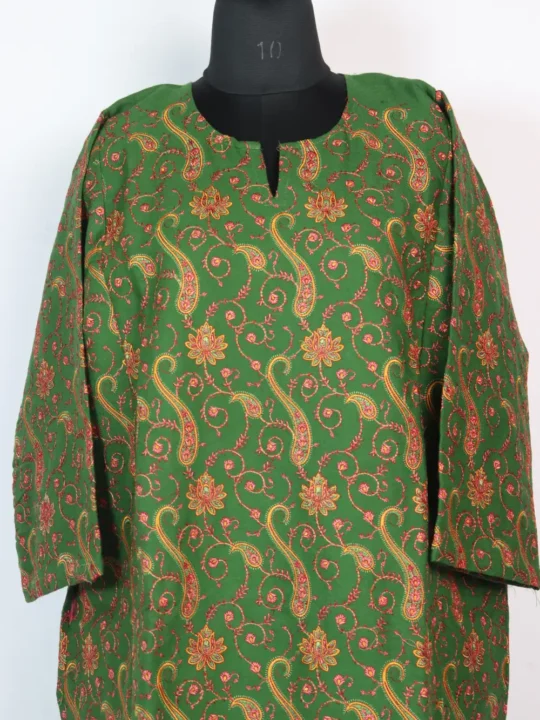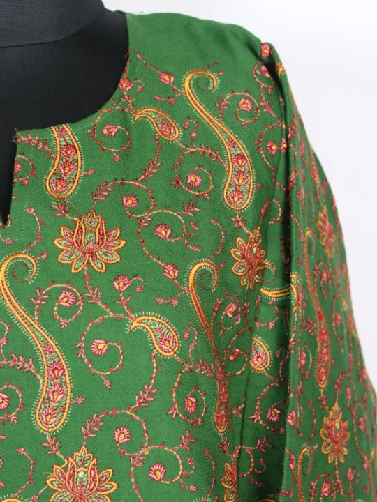 This green raffal wool pheran features fine embroidery placed in heavy borders and sleeve cuffs. The jaal embroidery spreads across the front, accented with huge badam and floral designs in yellow, pink and red hue threadwork. It is rich yet practical, it keeps you cozy while adding a refined look to daily and occasional wear.