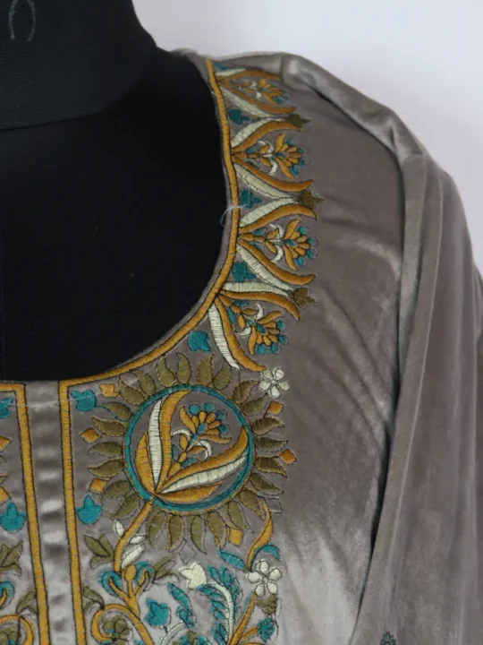 Velvet fabric gives this grey pheran a rich texture, while embroidery lends its beauty. At the neckline and sleeves, sozni embroidery reveals floral patterns which makes garment refined and elegant. Soft, cozy, and versatile, this pheran is an ideal addition to a winter wardrobe.