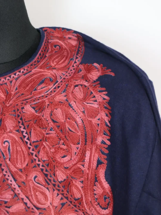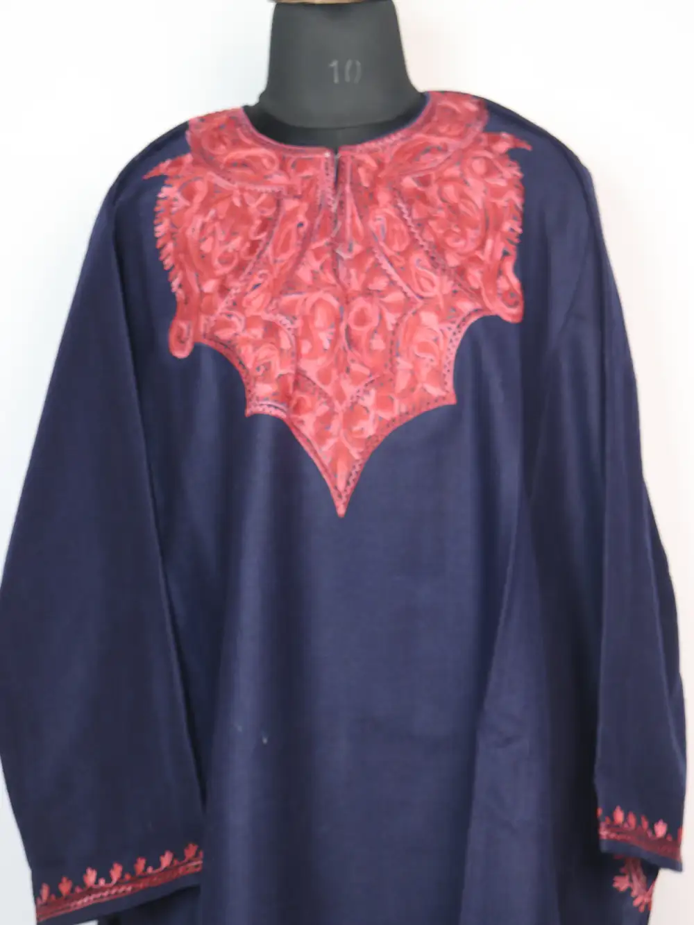 A graceful work of floral aari embroidery around the neckline, giving this tweed pheran a decent and traditional look that feels good for everyday wear.