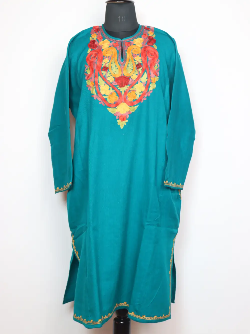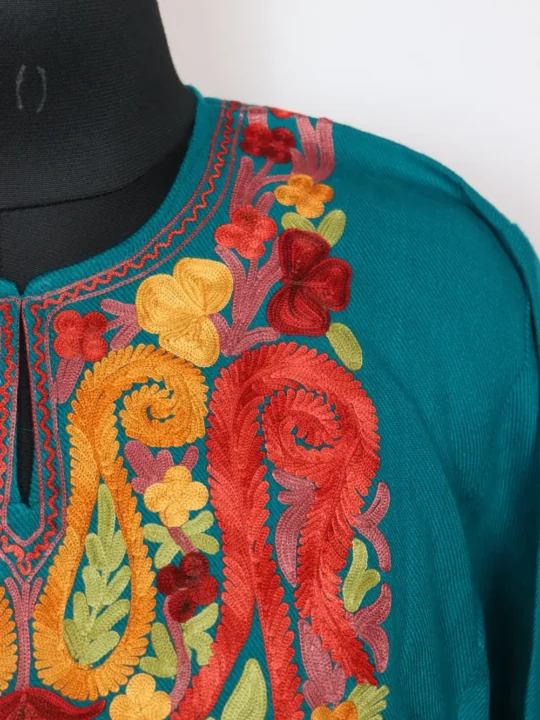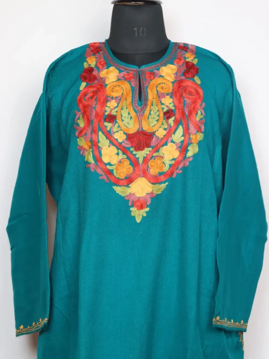 Stitched in cashmilon wool to suit cold climates, this stylish Kashmiri feran arrives in rama green colour. It features huge badam pattern aari embroidery which highlights the neckline.