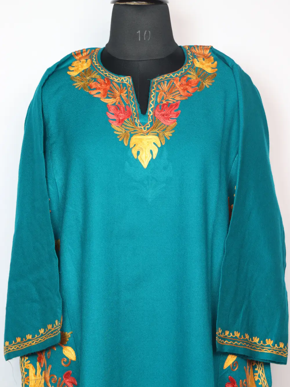 Oceanic Green Pheran with Aari Work in Cashmilon Wool Aniya