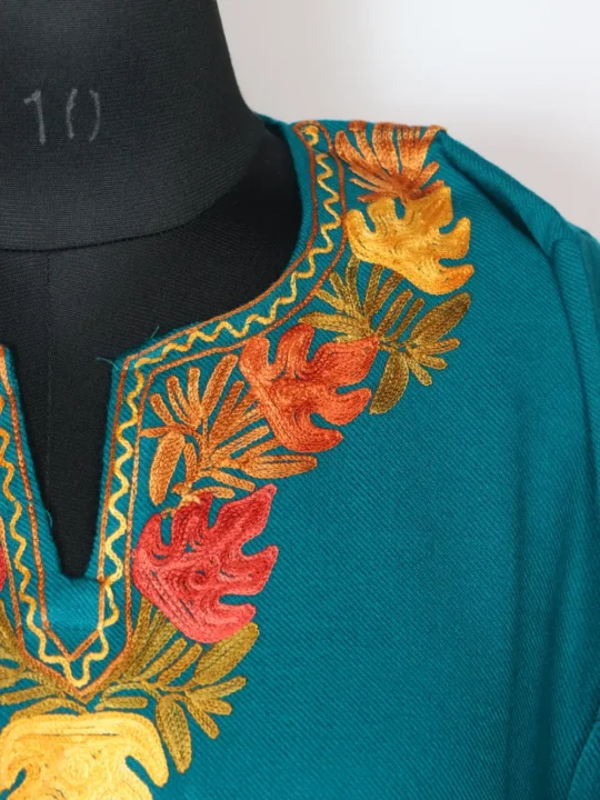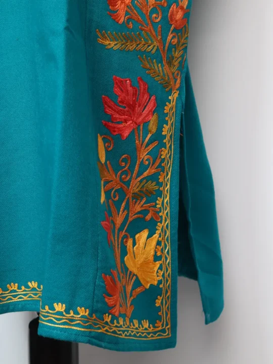 Warm cashmilon wool gives this blue pheran a soft feel, floral Chinari at neckline and side panels add refined detail, and pockets on both sides bring daily convenience.