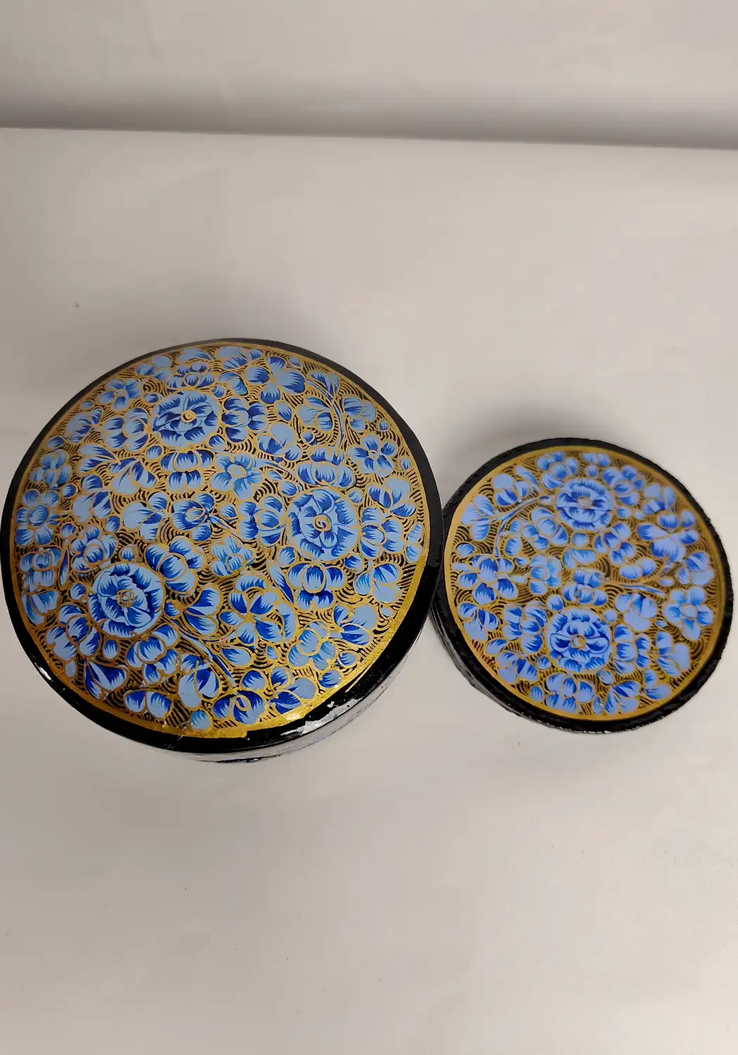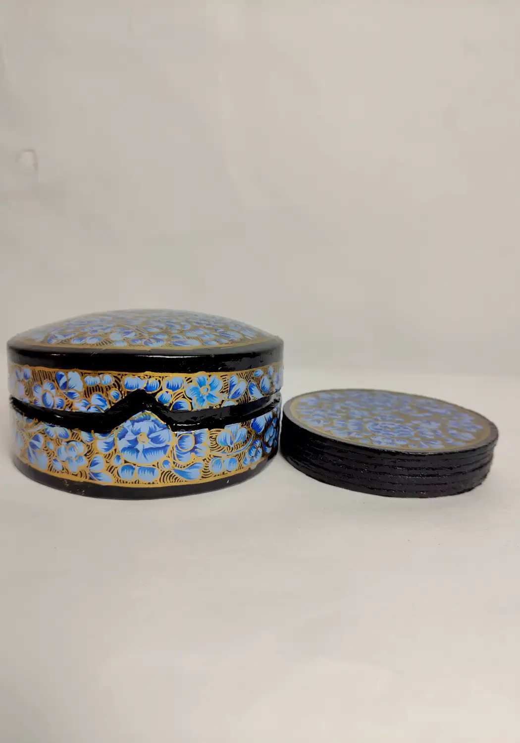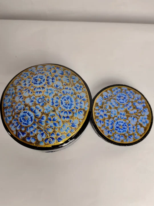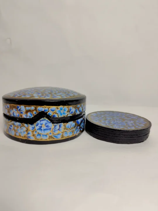 A set of six round coasters placed inside this box, designed with fine blue floral paper machie work. Each piece carries subtle artistry that adds character to everyday use, making the coaster set feel both functional and gently rooted in traditional Kashmiri craft.