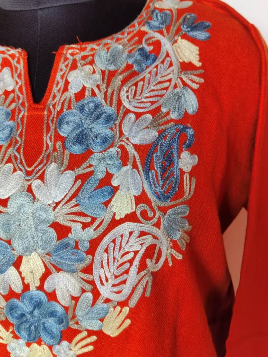 Designed with cashmilon wool, this aari work kurti is styled in rustic orange colour. Its fFloral aari embroidery is placed along the neckline.