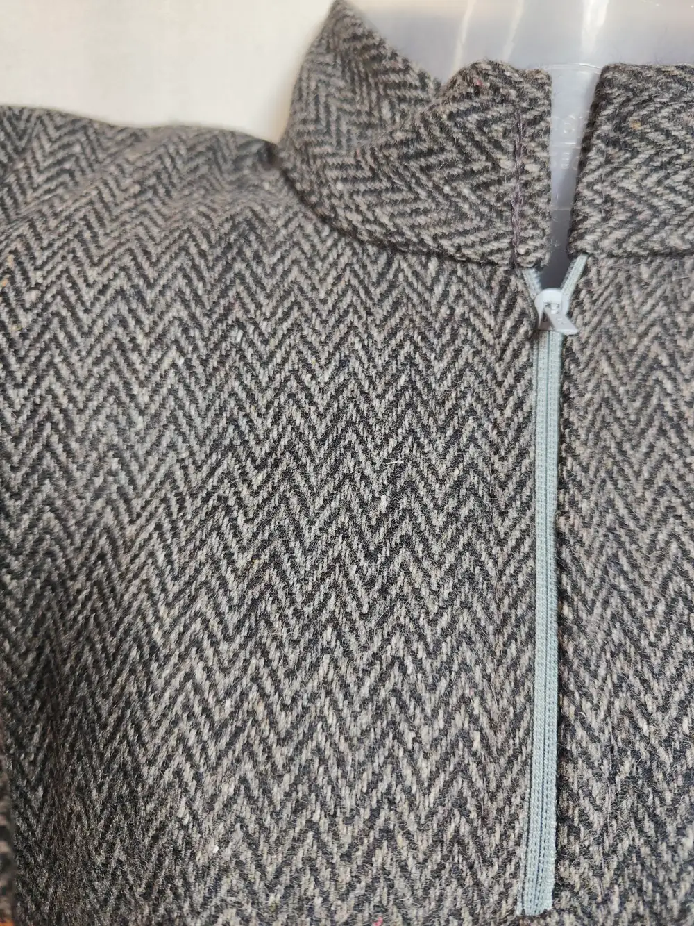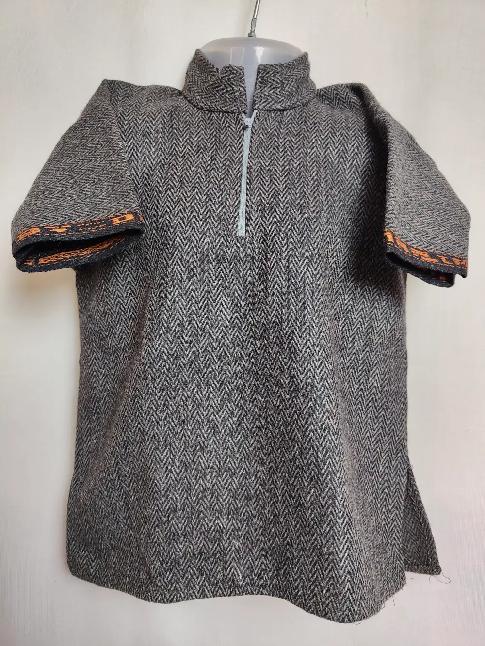 A child-sized phiran kashmiri dress in dark grey lakeer Tweed wool, made for chest size 30 inches and length 19 inches for everyday use. This phiran dress reads neat and Kashmiri, offering warmth and a tidy neckline while remaining playful and wearable.