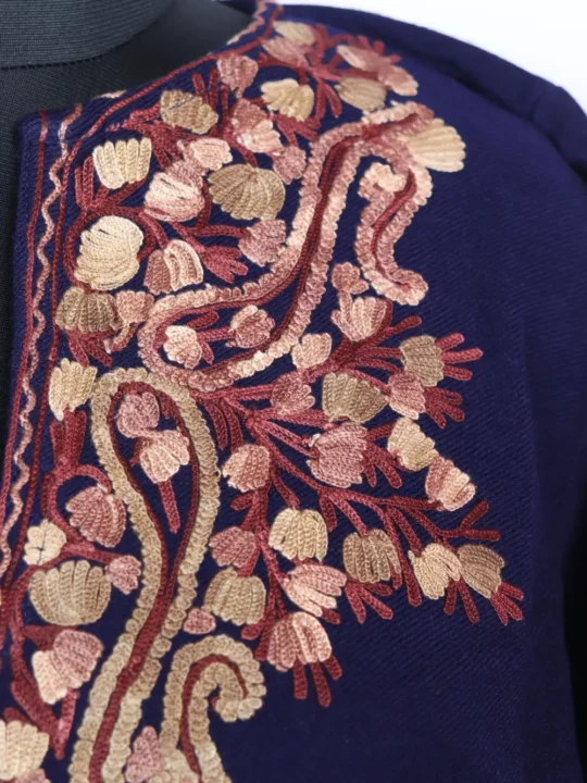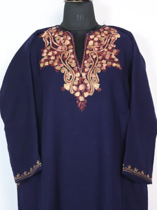A relaxed dark blue pheran in Cashmilon wool with Aari badam and floral at the neckline; pockets on both sides make it practical for daily wear. This Pheran balances warmth and craft.