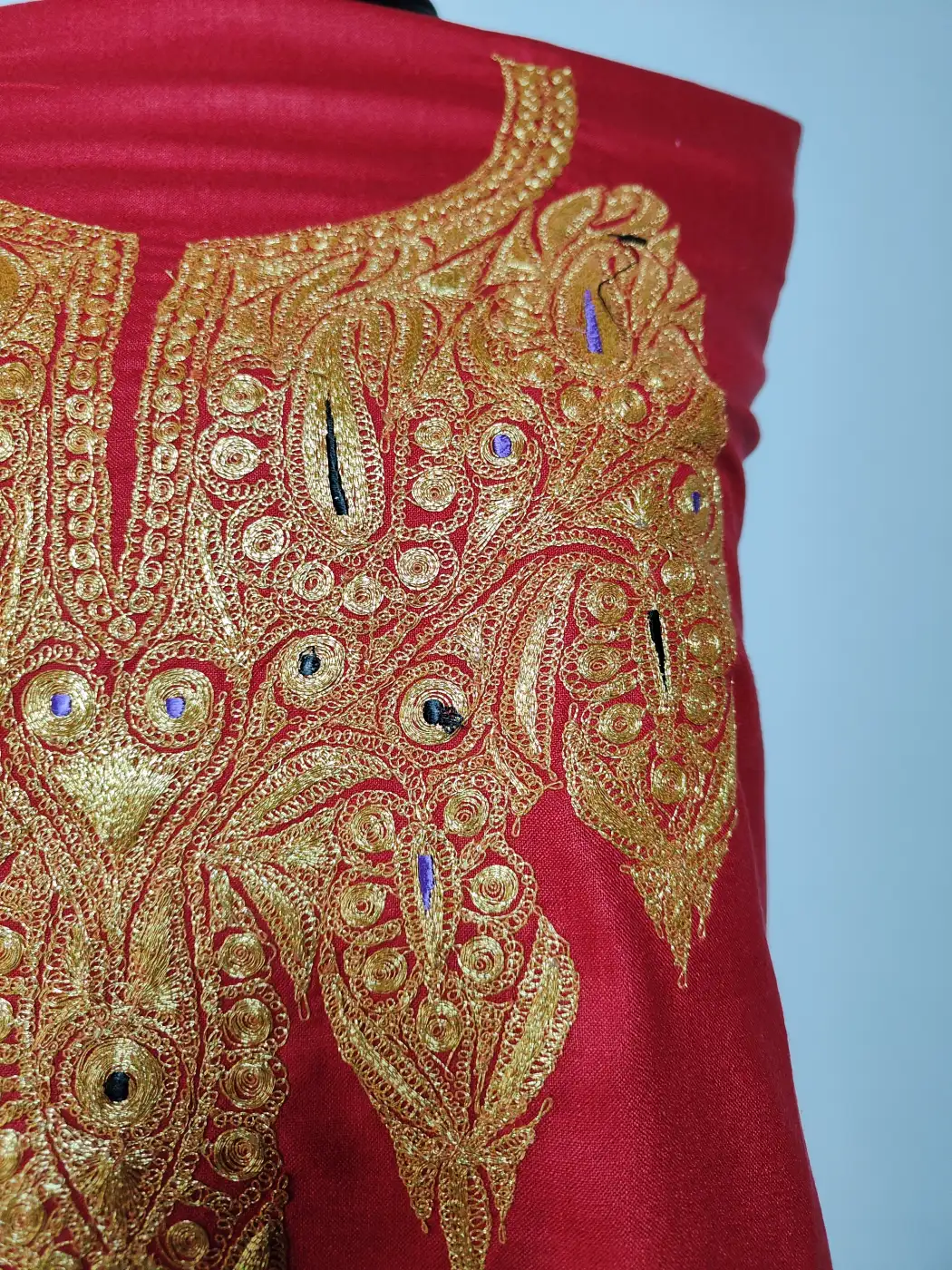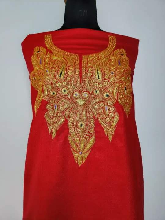 Floral and badam botte tilla detailing at the neckline adds a graceful touch to this Kashmiri embroidery 2pc suit. The red ruby cotton base keeps it refined and easy to wear. As an unstitched 2pc salwar kameez, it allows complete flexibility in stitching and styling.