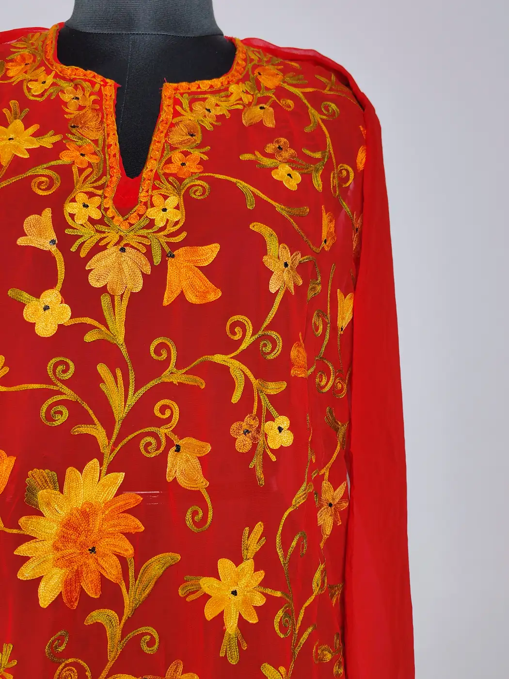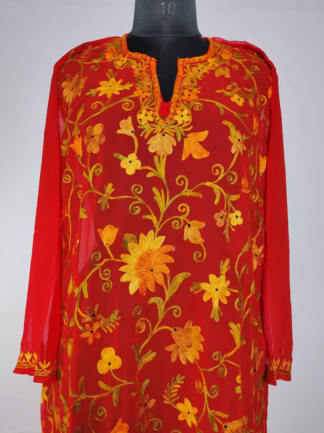 Vine embroidery softly traces the all-over fabric, while the neckline carries continuous floral aari work around it. Crafted in red hue georgette, this outfit reflects a balanced and gently detailed traditional style.