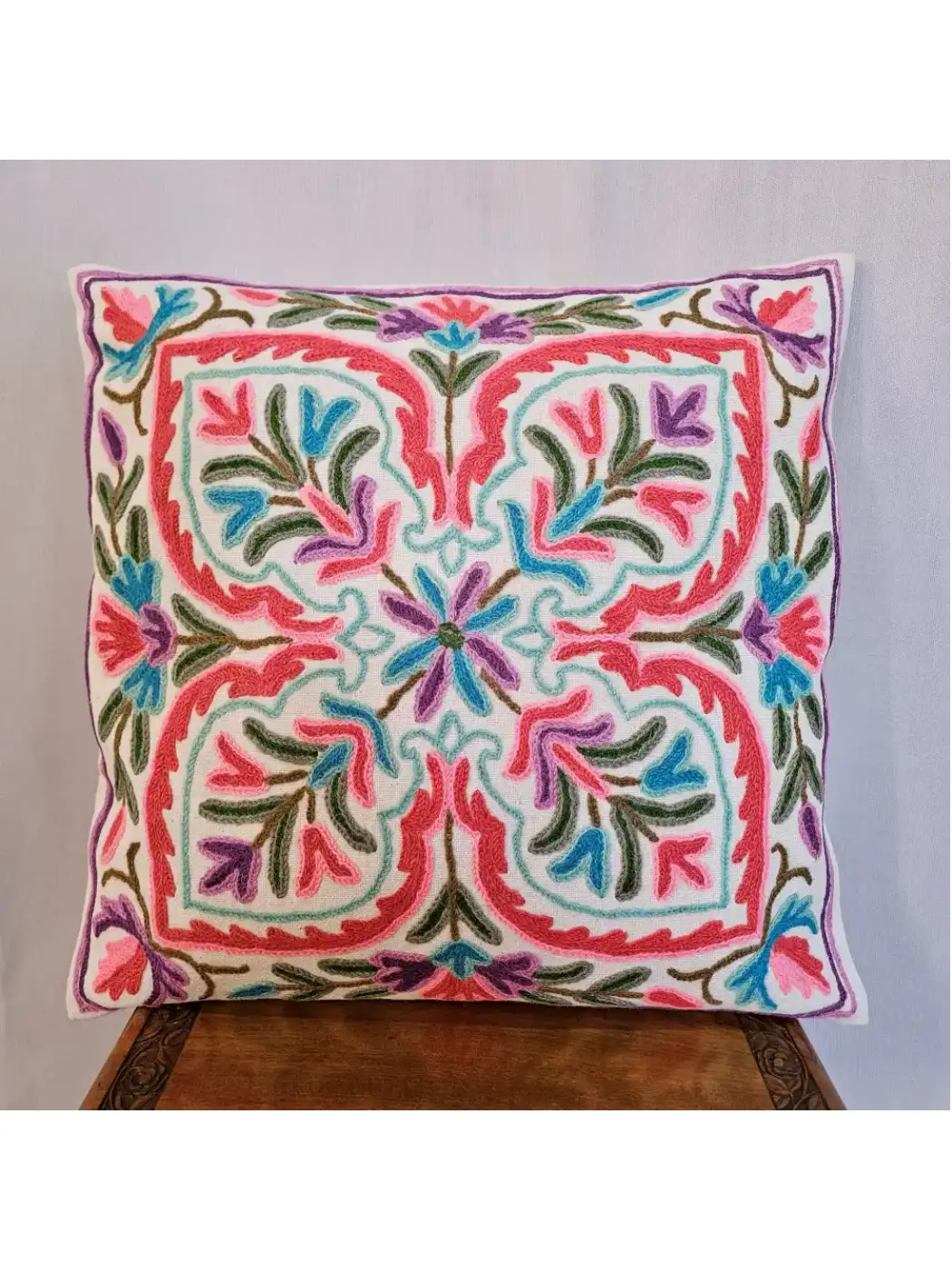 Add elegance to your living space with this pair of Kashmiri cushion covers. It is beautifully adorned with hand crewel embroidery. The vibrant base is crafted from high-quality Kashmiri Dusoot cotton, ensuring a soft and durable texture. It features intricate wool thread embroidery, this set is perfect for enhancing your home décor while offering a blend of traditional and modern aesthetics. These 16×16-inch covers are easy to maintain and ideal for adding a splash of Kashmiri artistry to any room.
