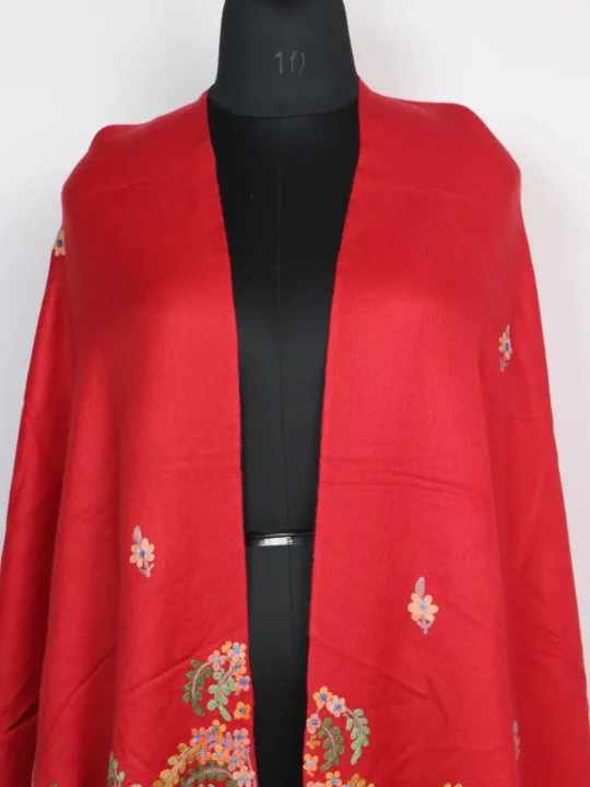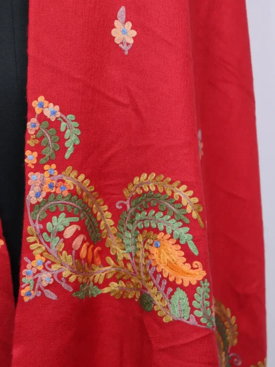 Made in silk and pashmina this red colour stole pairs smooth feel with its aari embroiderythat has been done in contnuous border and booti style, giving a composed decorative rhythm.
