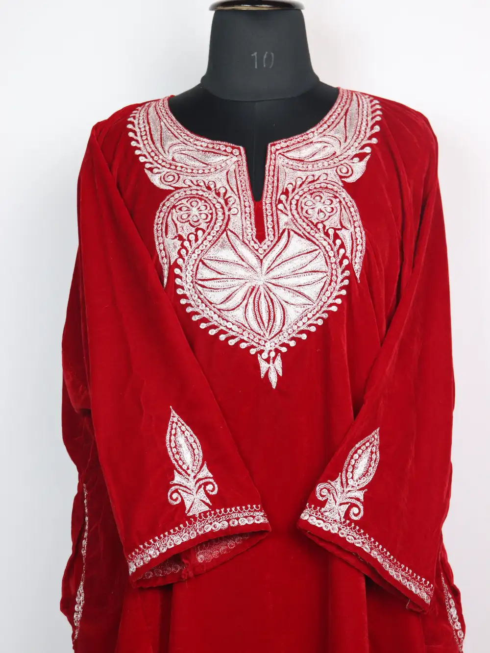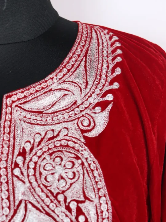This pheran crafted in velvet fabric pairs warmth with practicality; it includes pockets both side that sit neatly. Botte tilla embroidery frames the neckline and sleeves with elegant curved stitches, creating an ornamental band that adds a refined Kashmiri touch without fuss.
