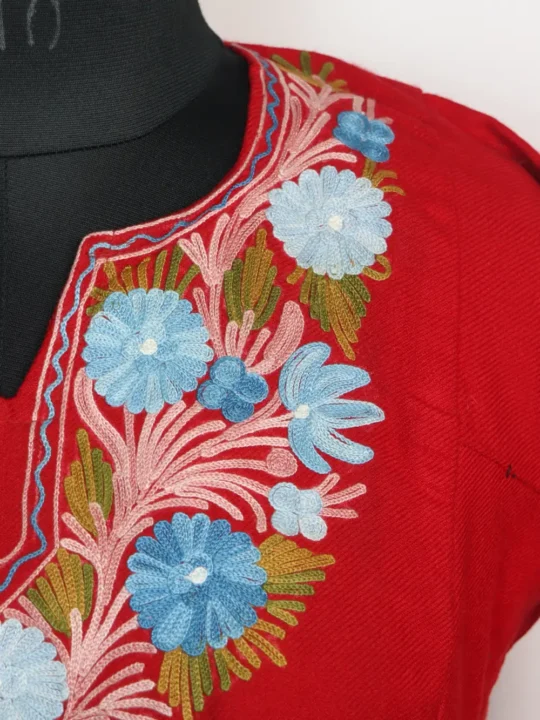 Best short kurtis in red colour crafted in cashmilon wool. It is adorned with aari embroidery at the neckline in floral motifs.