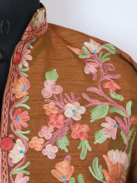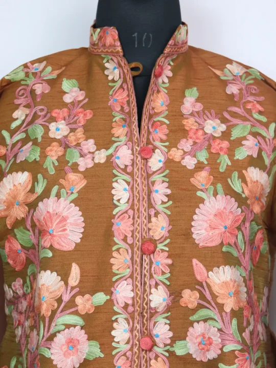 Crafted in Silk this brown colour short coat shows Aari embroidery concentrated at the collar and flowing into the front side in floral motifs. Its chest size 42 and length 31 inches allow easy layering.