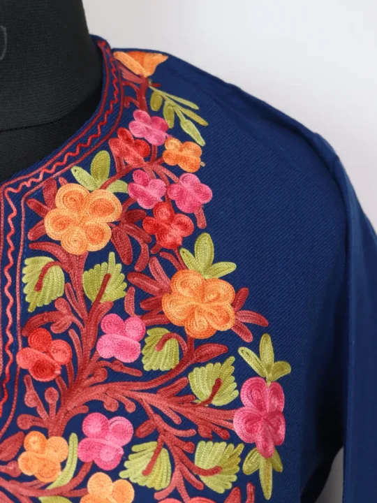 Navy blue Cashmilon Wool and elegant Aari kadhai at the neckline in floral patterns frame this Kashmiri Kurti which you can get in just 1249 rs.. This Kurti balances warmth and craftsmanship, you can pair it with simple bottoms for a elegant look that’s ready for seasonal layering and movement