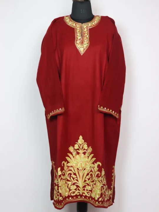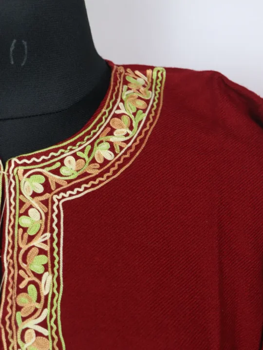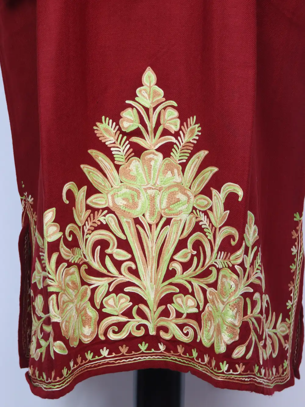 A warm rekhta feran made in cashmilon wool, with floral motifs across neckline and detailed aari work at the bottom. It includes two side pockets which makes it practical for winter use.