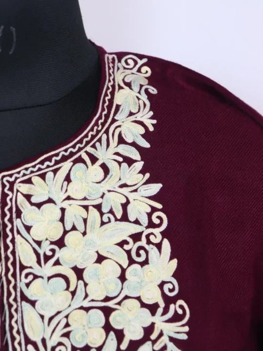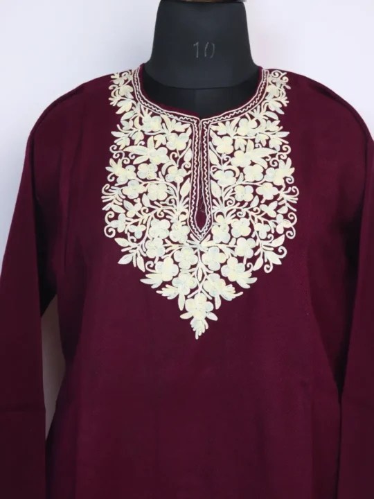 Cashmilon Wool shapes this magenta hue embroidered kurta for women with floral motifs around the neckline, it comes with chest size 46 inches and Length 32 that makes it a graceful, wearable item.