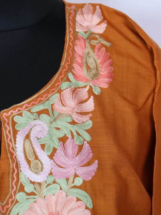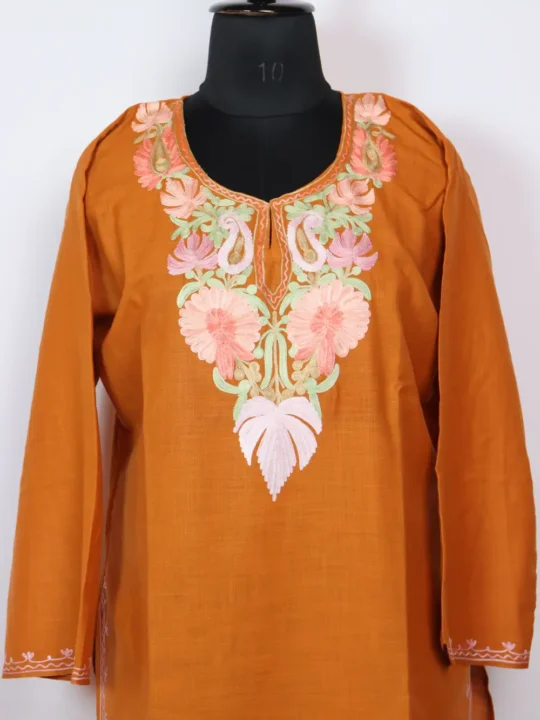 Soft Ruby Cotton in mustard hue threads and floral and chinar-badamĀ Aari at the neckline shape this Kashmiri Kurta Set into a calm wardrobe piece. Its chest size 46 inches and length 40 ensure a tidy fit; this Kurta Set pairs simply with minimal accessories.