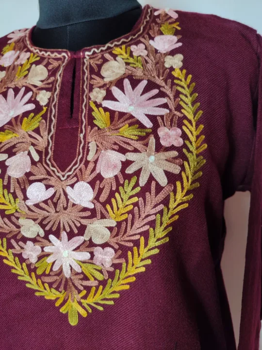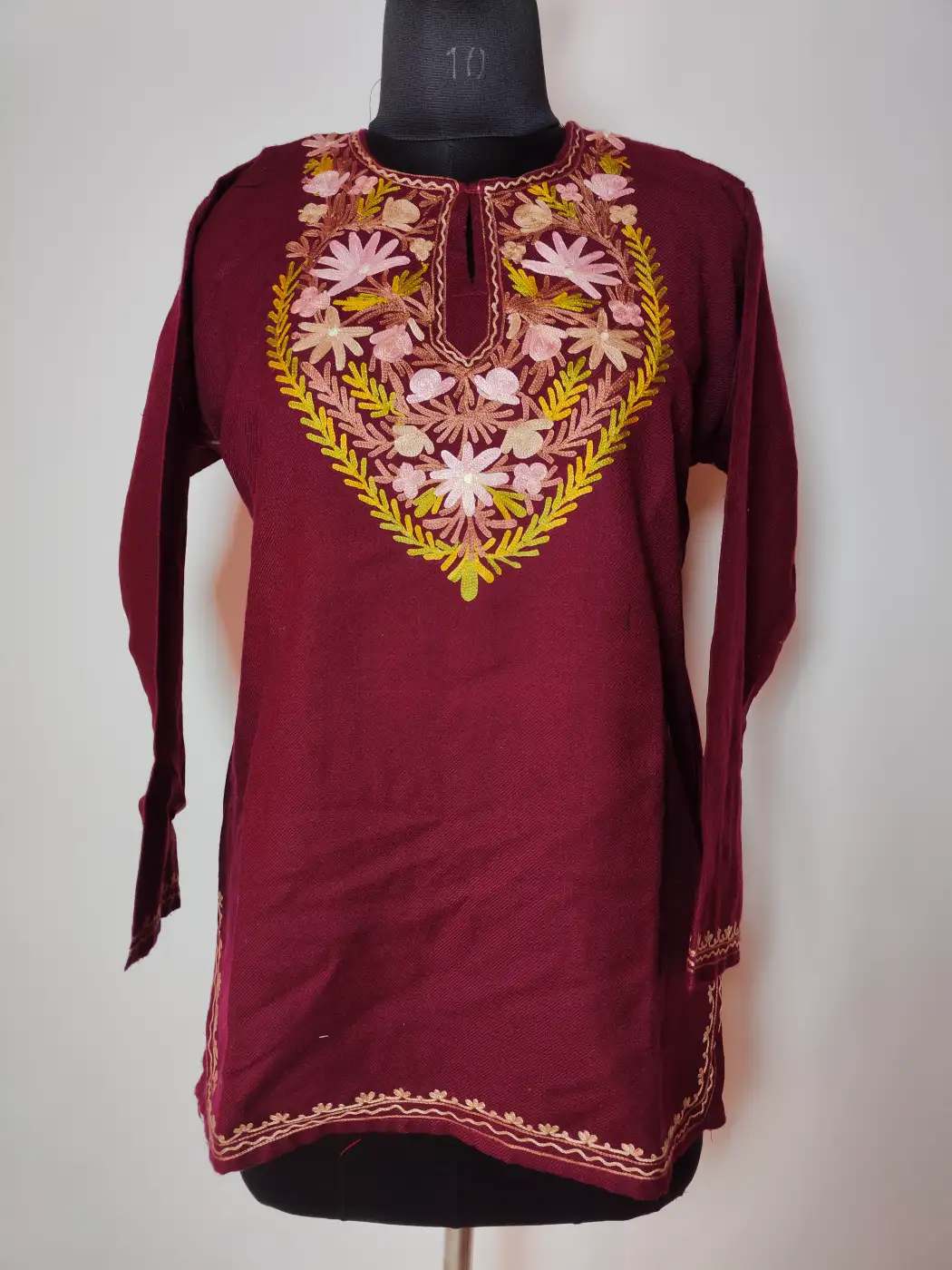 Woven in cashmilon wool, this Kashmiri work kurti is finished in wine colour. It features floral aari embroidery which decorates the neckline.