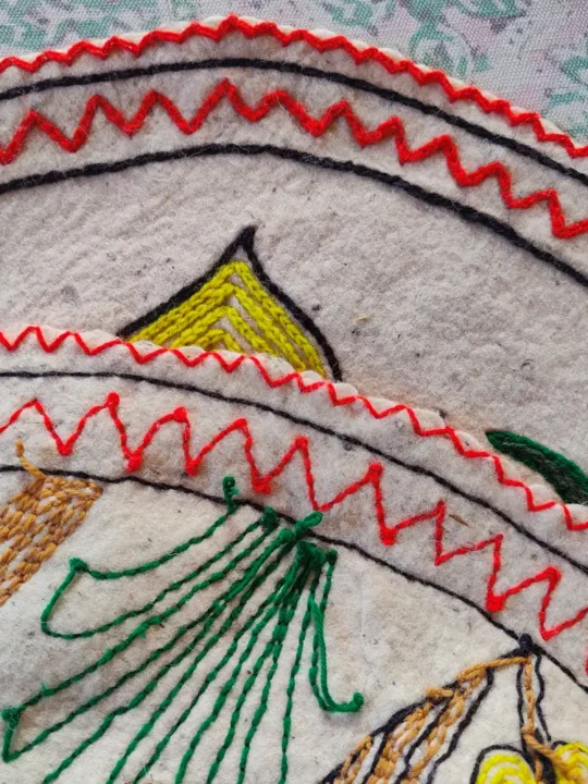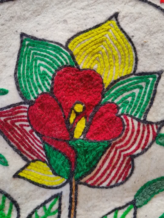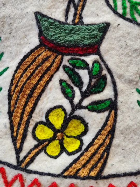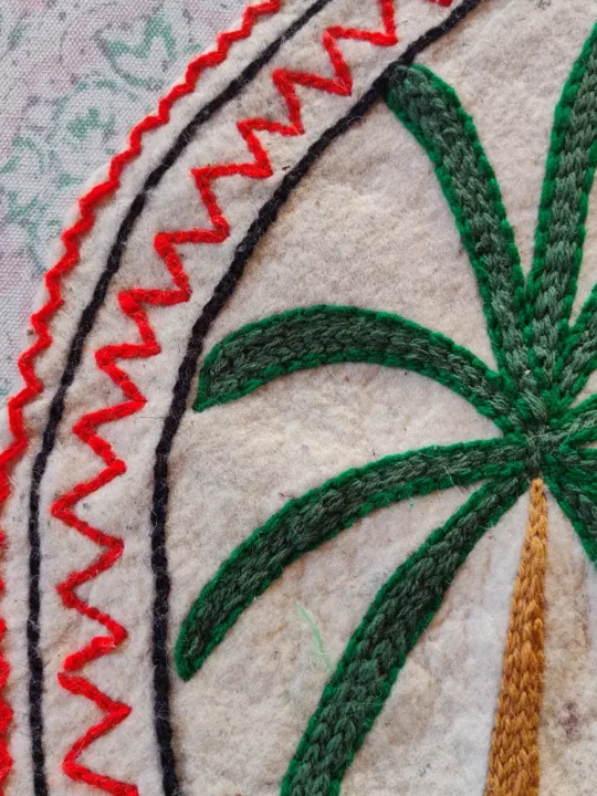 Round and richly detailed, this 2.4 ft Namda is a handcrafted Kashmiri treasure. Its wool base will offer you a warm, soft feel, while its hand Aari embroidery that showcases central motif of a red flower with green leaves and yellow center, surrounded by two palm trees on both sides, adds elegance through the pattern. It is perfect as a centerpiece rug or layered for a cozy corner, it brings a unique circular charm to your décor. It has been made in Kashmir by skilled artisans, it’s both functional and a testament to the valley’s artistry.