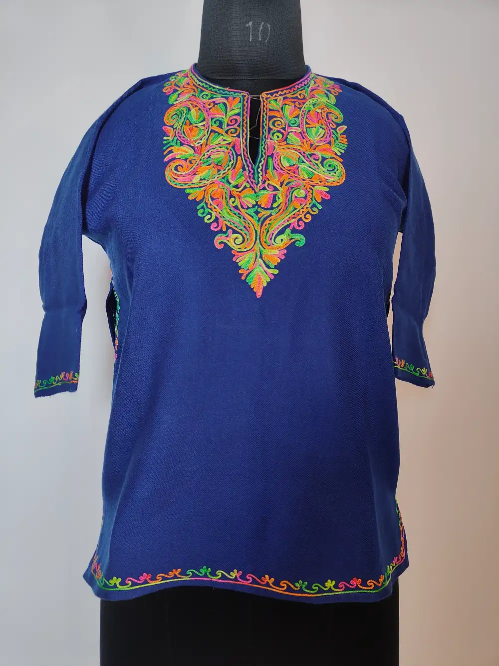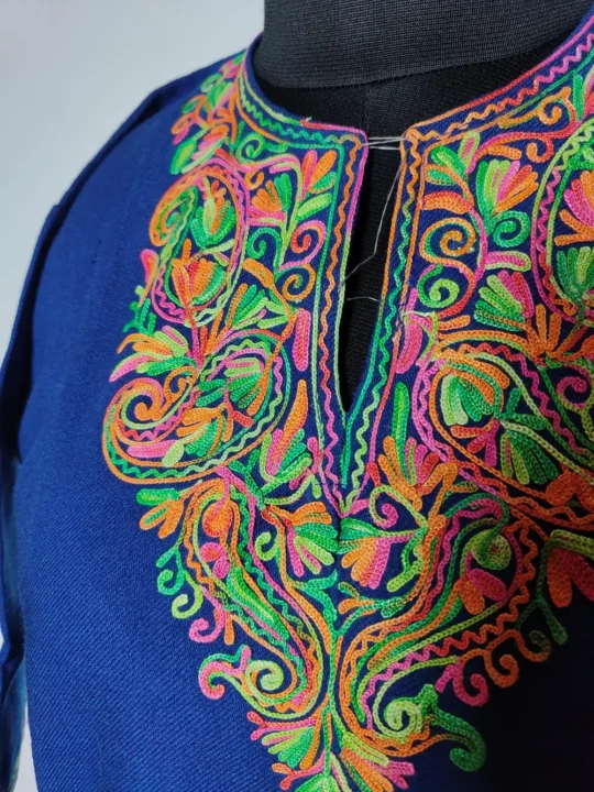Kashmiri traditional dress pheran in royal blue colour drapes in cashmilon wool with gentle warmth, enriched with floral badam aari embroidery at the neckline. Its both-side pockets make it a practical pick for little girls