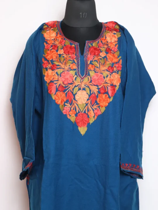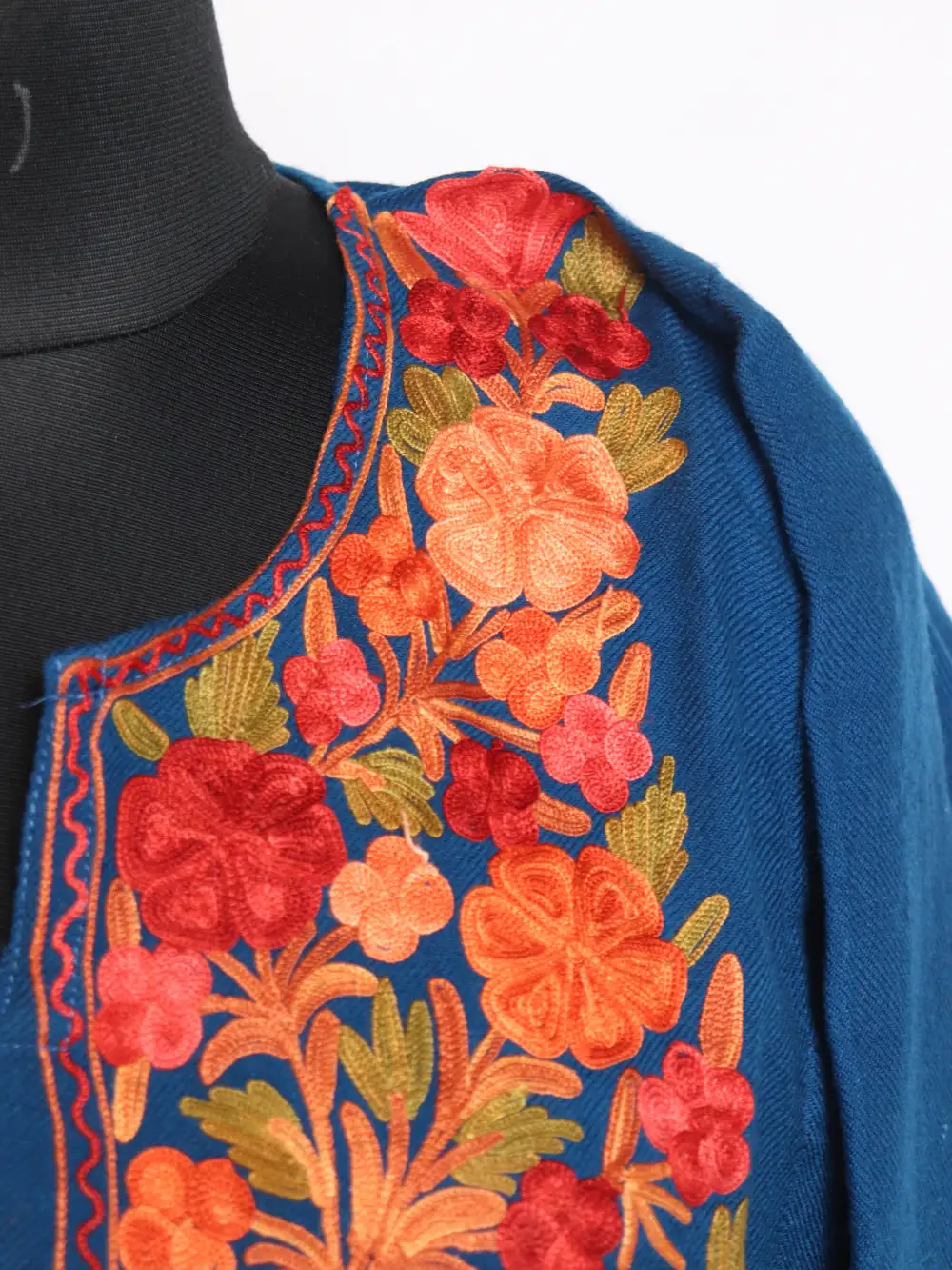 Crafted in Cashmilon Wool this royal blue colour pheran shows floral Aari work at the neckline and it includes pockets on both side for practical use. It is suitable for winter.