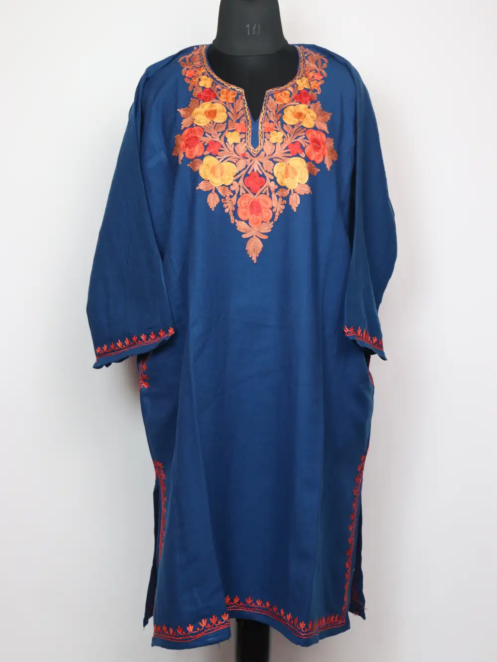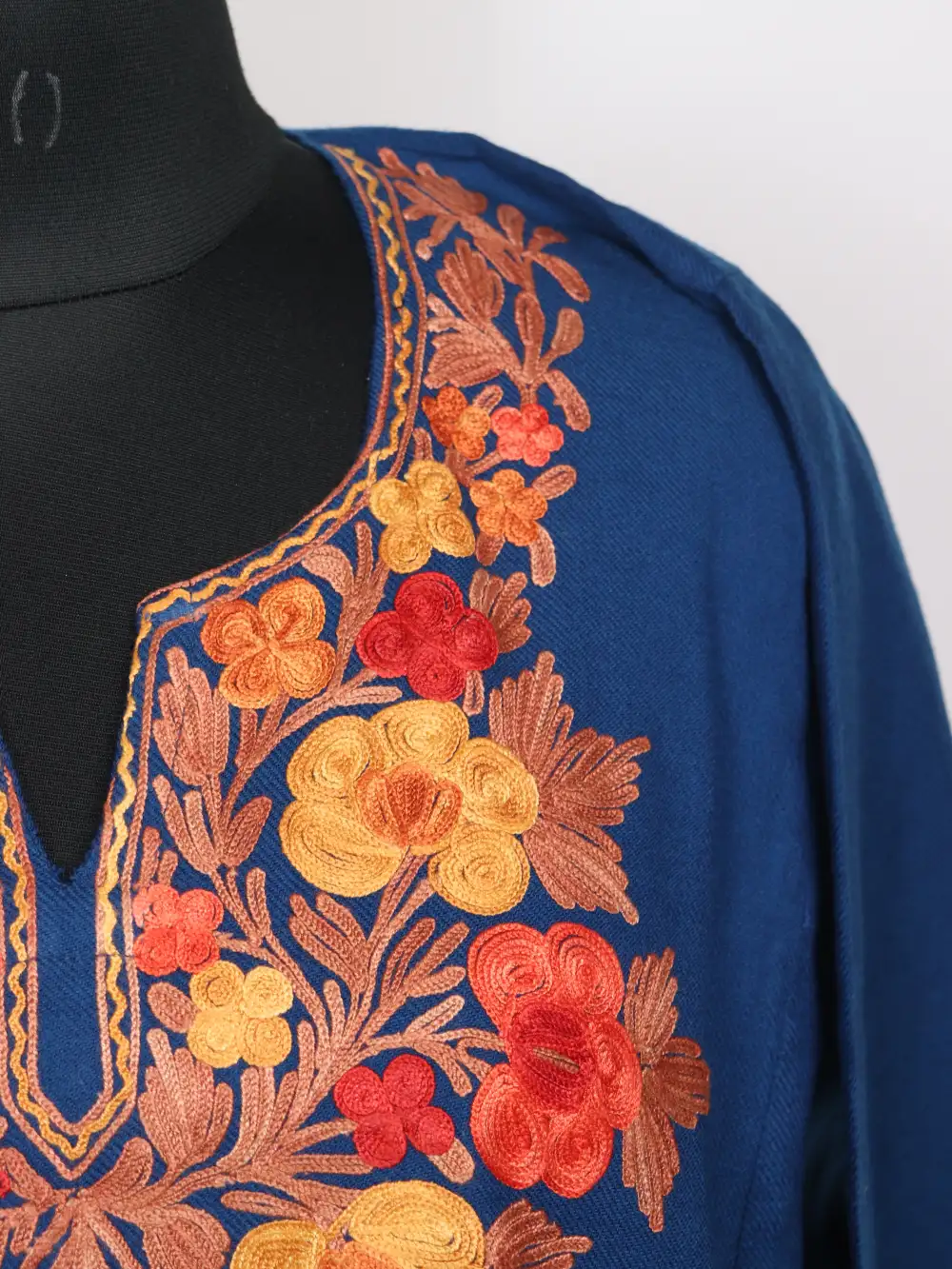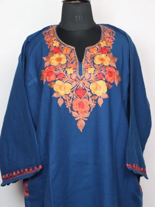 Refined royal blue pheran dress in cashmilon wool features floral Aari embroidery along the neckline. It blends wearable warmth with understated ornament, which makes it a graceful and practical Kashmiri choice today.