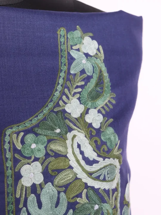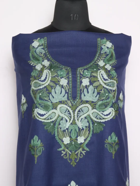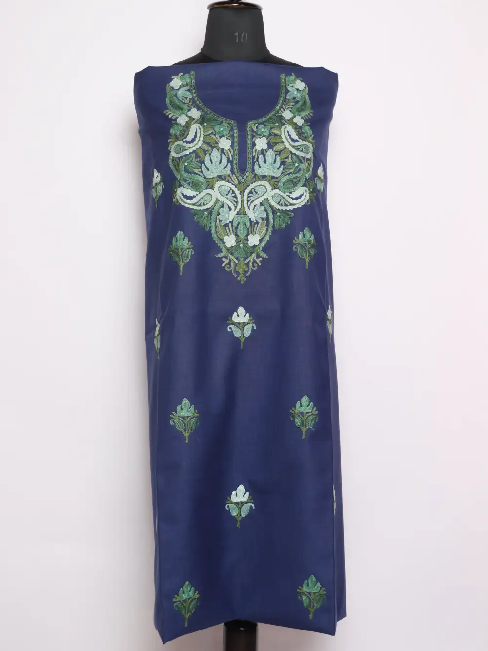 Designed in Ruby cotton, this 2pc royal blue suit comes unstitched so you can have it tailored to your own style. The neckline has been adorned with Aari embroidery, where huge and tiny badams and chinar forms in green blend gracefully and the front panel has been adorned with matching bootis to enhances its overall look. Together, the colors and motifs uplift this piece, which turns it into something both fresh and refined. A perfect balance of fabric ease and subtle artistry.