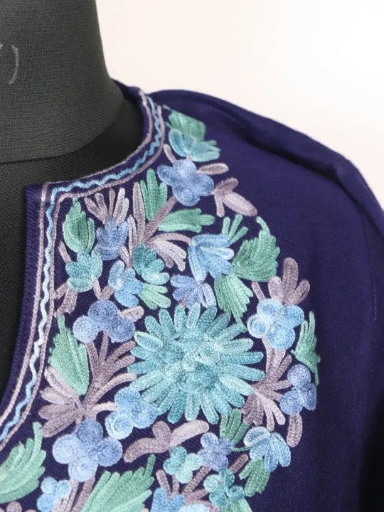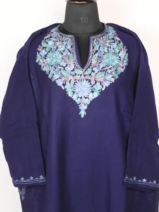 Floral Aari embroidery at the neckline accentuates this royal blue Cashmilon wool Pheran, it comes with both side pockets which enhance its practicality. Our kashmiri phiran for females includes this pheran which you can buy at 1249..