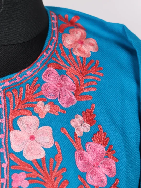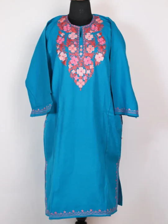 This blue pheran in cashmilon wool offers a warm yet light layer for women. The neckline is embroidered with red vine and pink floral motifs in Aari style, giving this outfit an elegant lift. Its soft fabric ensures comfort, while the design adds a feminine charm. It is ideal for winter wear, it works well at home or outside, providing a practical yet graceful option for colder days.