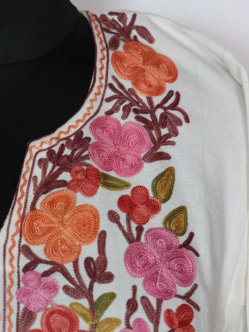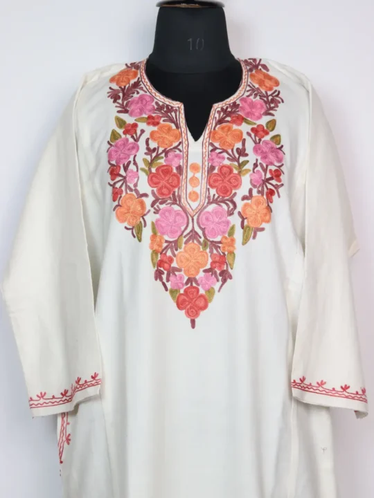 Crafted in Cashmilon wool, this white phiran dress carries Aari embroidery at neckline done in floral motifs. Chest size 52 inches and length 44 shape it to drapes smoothly.