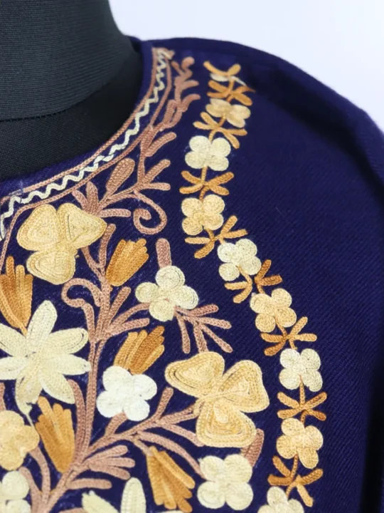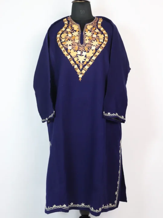 Crafted in cashmilon wool, this dark blue pheran shines with its embroidery. The neckline is finished with floral patterns in brown and mustard threads, that enhance the garment further. Its soft warmth makes it perfect for winter use, while the embroidery brings sophistication. It is a timeless option that allows comfort and cultural elegance to come together effortlessly.