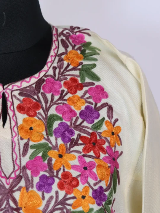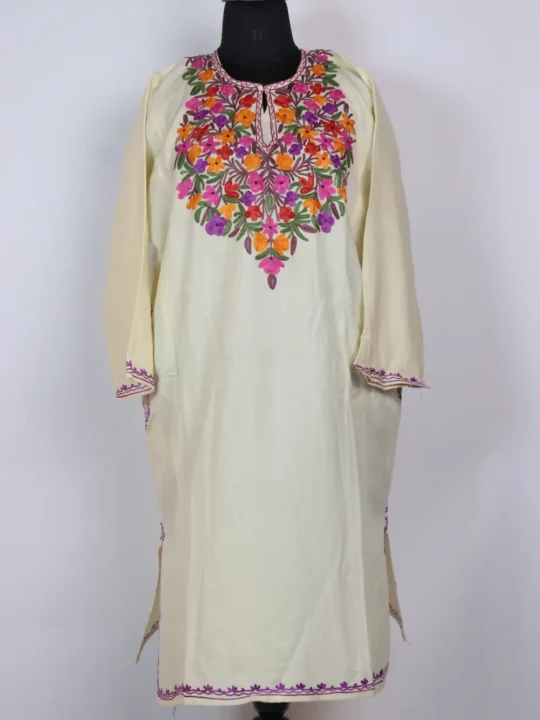 Designed for women, this pheran in cashmilon wool offers a cozy yet stylish garment for winter. The neckline is decorated with many color floral motifs such as pink, purple, red and mustard by using Aari embroidery, lending it a refined charm. It is made light but warm, it ensures ease of wear while carrying elegance. It is perfect for everyday use, it remains a timeless addition to wardrobes, bringing beauty and practicality together in one garment.