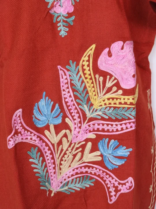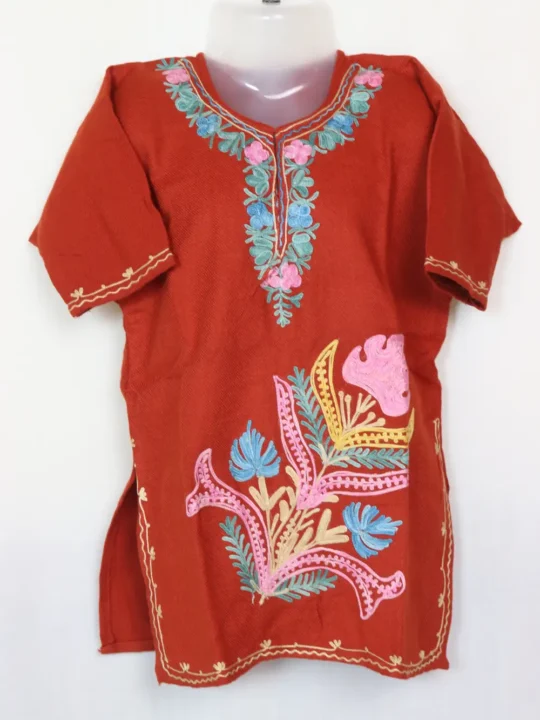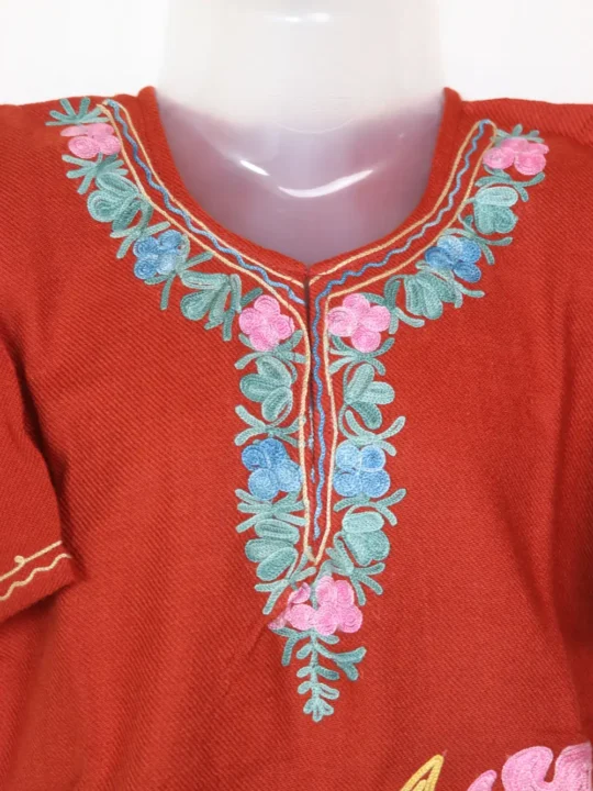 A gentle option in girls woolen kurta, this Kids Kurta in Cashmilon wool shows floral Aari embroidery around the neckline and bold floral embroidery on the front panel. It is made for 2-3 year old girls, comes with a 28-inch chest and 22-inch length, this rust Kurta offers neat Kashmiri kadhai and easy winter comfort.