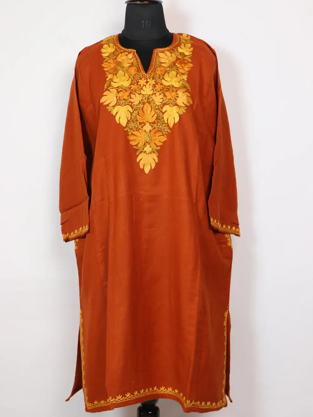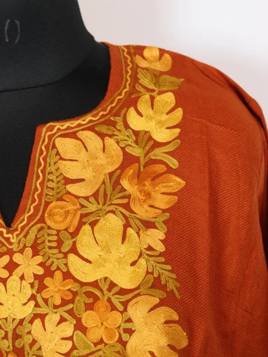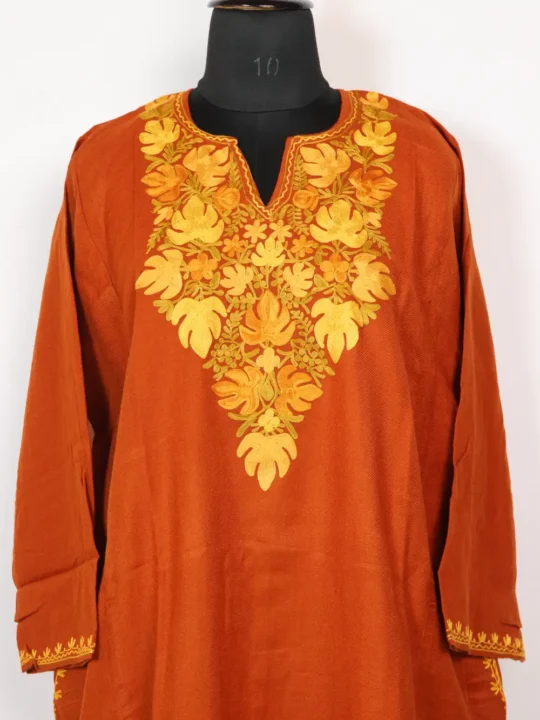 A beautifully tailored rustic orange Cashmilon wool pheran, it is adorned with chinar Aari embroidery at neckline, awaits you to buy it for making you remain comfortable against the chilly winter.