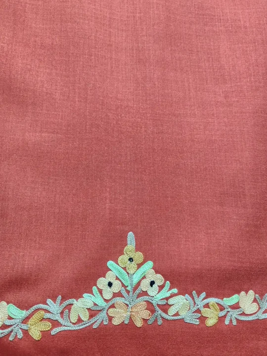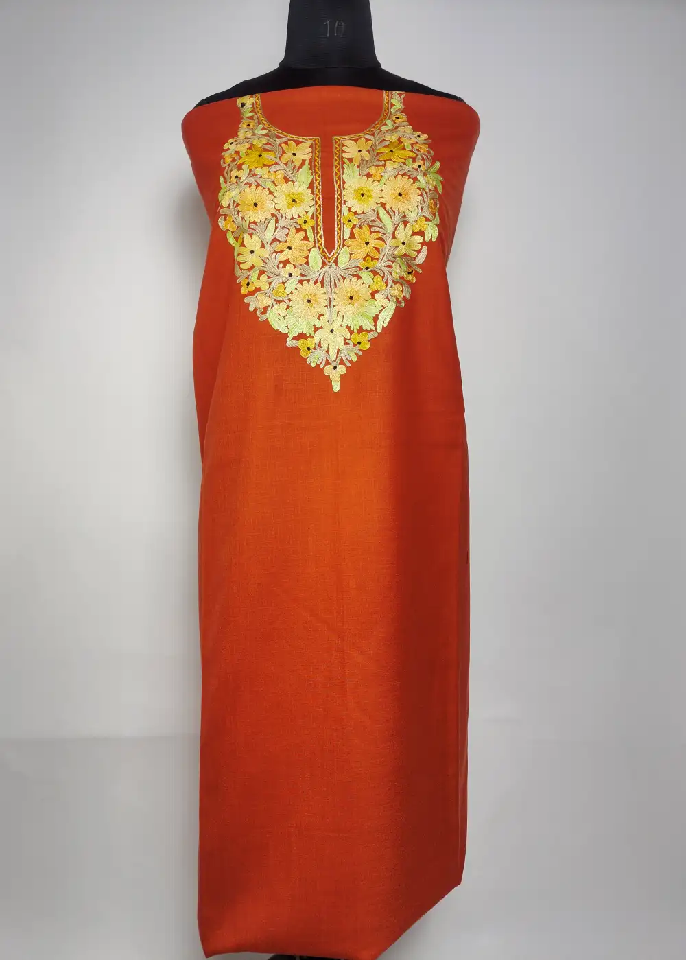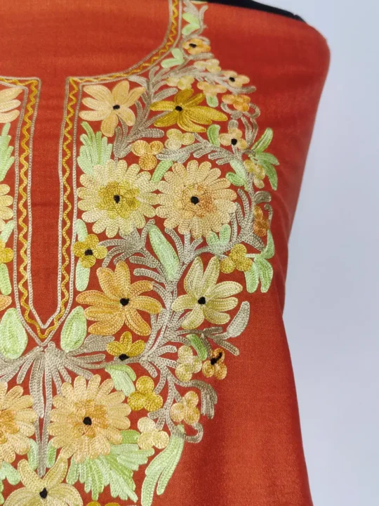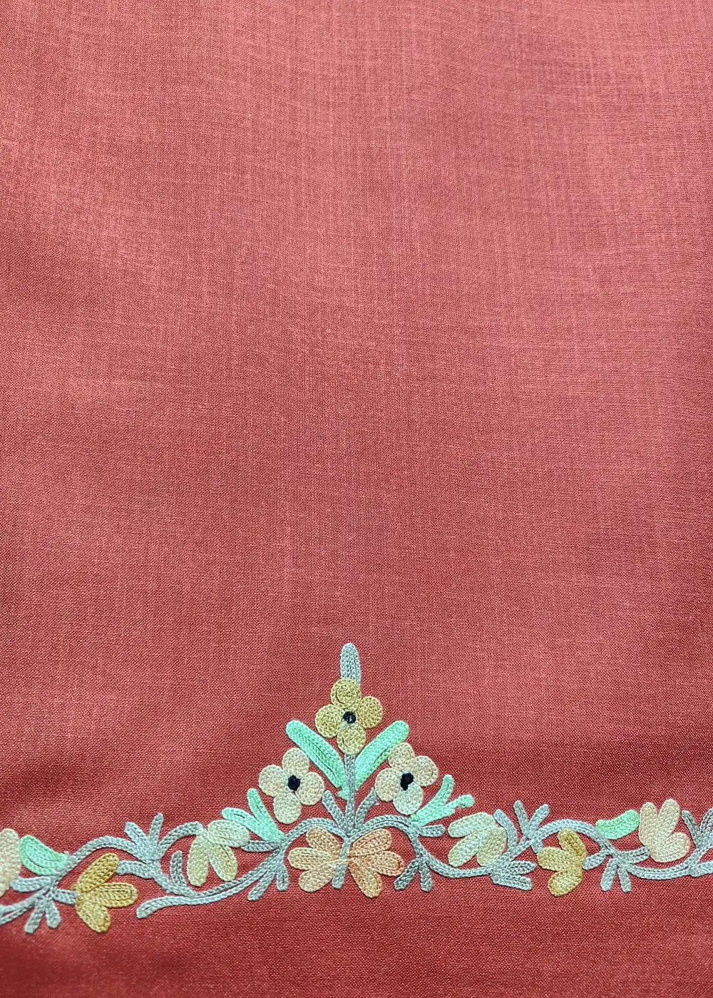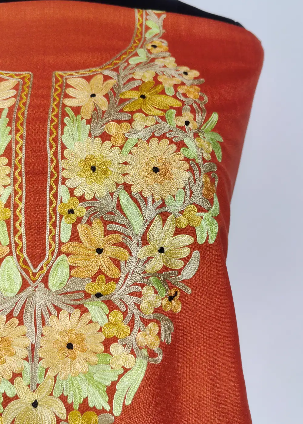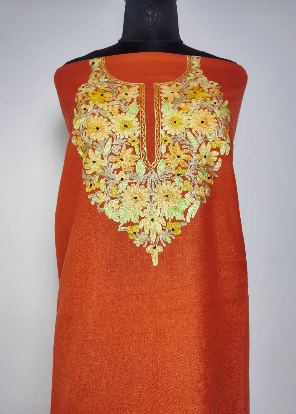 This Kashmiri embroidery suits design in ruby cotton features graceful floral Aari kadhai around the neckline that adds a classic traditional touch. The fabric feels light and breathable, making it a great choice for hot days as it helps keep you cool and comfortable. A beautiful pick among embroidery suits for women and cotton summer suits, offered unstitched so you can stitch it to your own fitting.