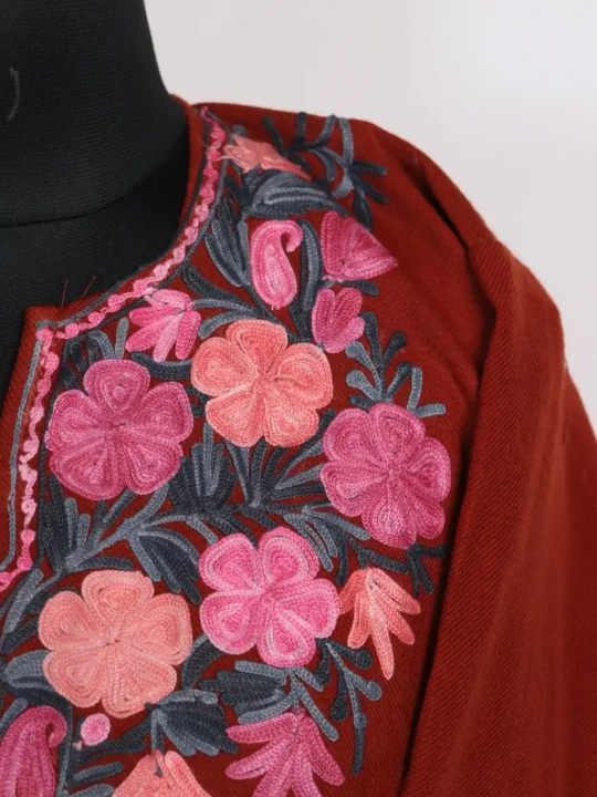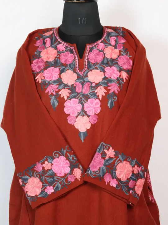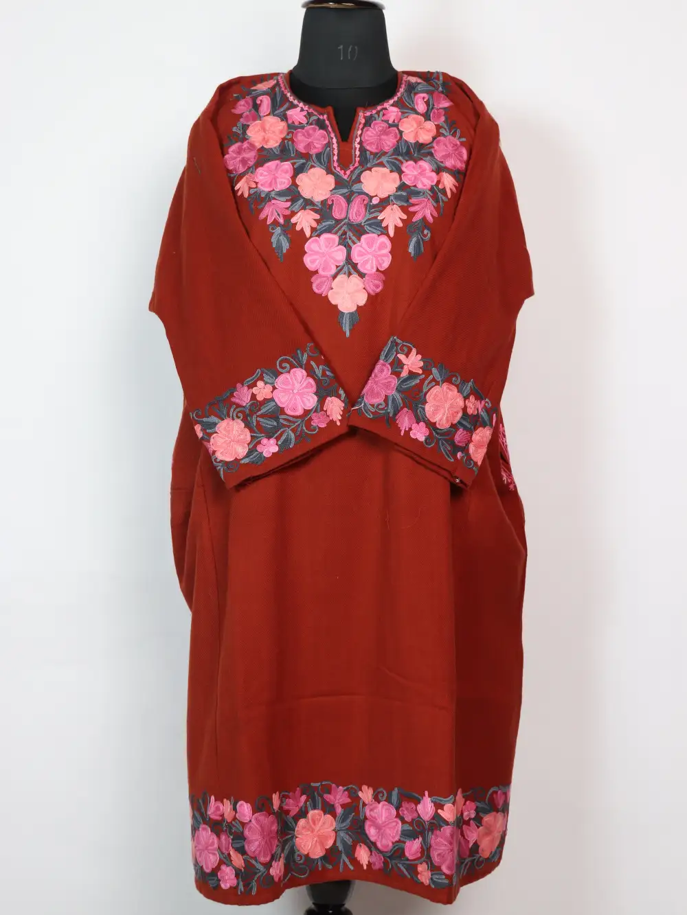 Aari Kadhai at the neckline, borders and sleeves in pink and green hue threads creates a floral with leaves frame on this rust colour Cashmilon Wool for a refined Kashmiri Pheran. This phiran dress comes in 56 inch chest size and 43 inch length and offers gentle winter warmth. You can wear this elegant Pheran with simple pants or layer under a shawl. Buy right now to secure this understated traditional design.