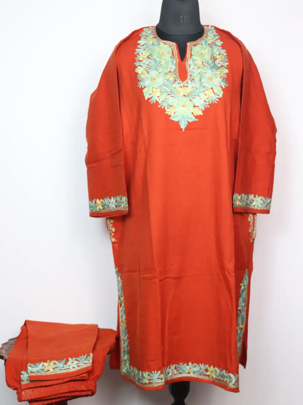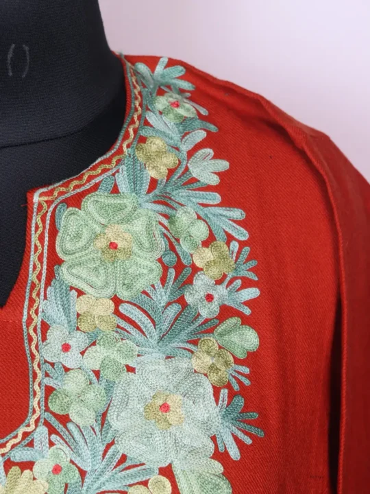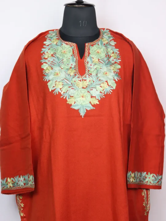 This Rust Orange pheran set is made from soft cashmilon wool and includes a matching lower, with graceful posh bagh aari embroidery around the neckline. The fabric feels comfortable and warm throughout the day.