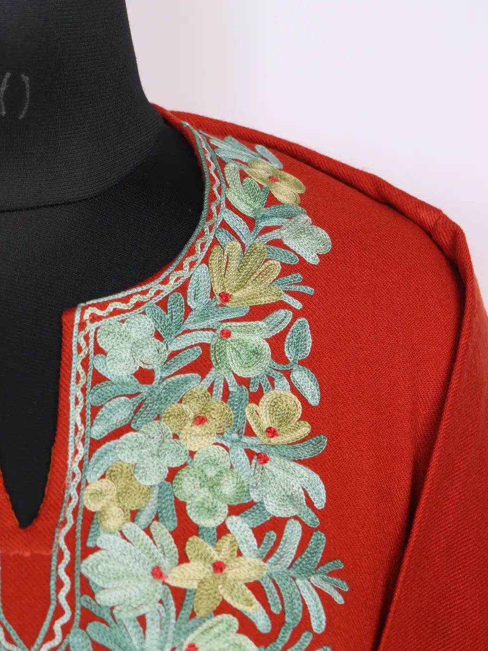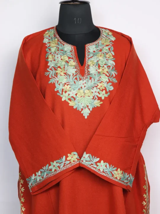 Rustic orange coloured Kashmiri faran with Aari embroidery in floral patterns, at the neckline, sleeves and border and pockets on both side is a practical winter layer.