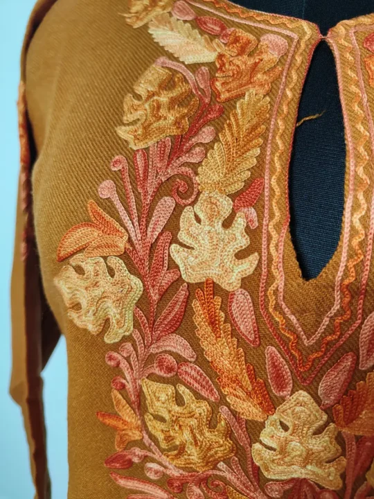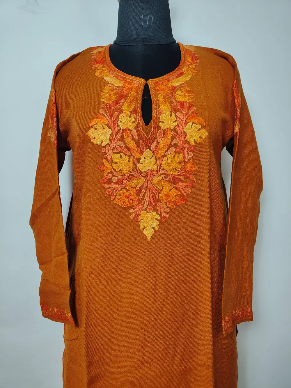 A kurta set in rustic orange made in cashmilon wool, designed to keep you warm yet light through winter. The neckline carries embroidery done in Aari, showing floral with chinar motifs in orange and mustard. This combination highlights the piece with both subtle color and delicacy. It blends softness with seasonal grace, which makes it perfect for women who enjoy both comfort and style.