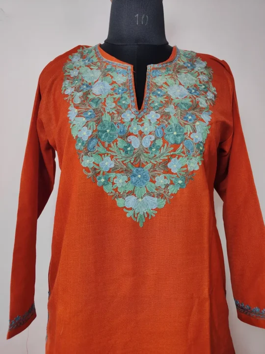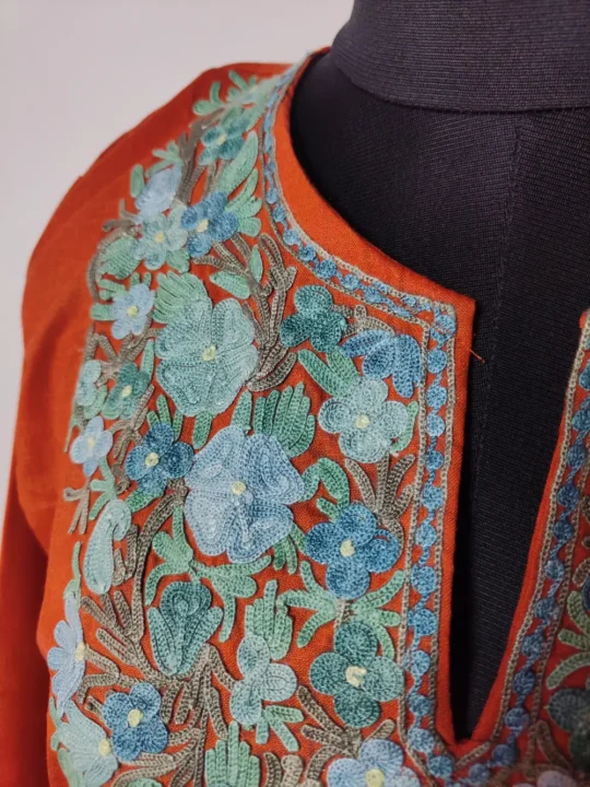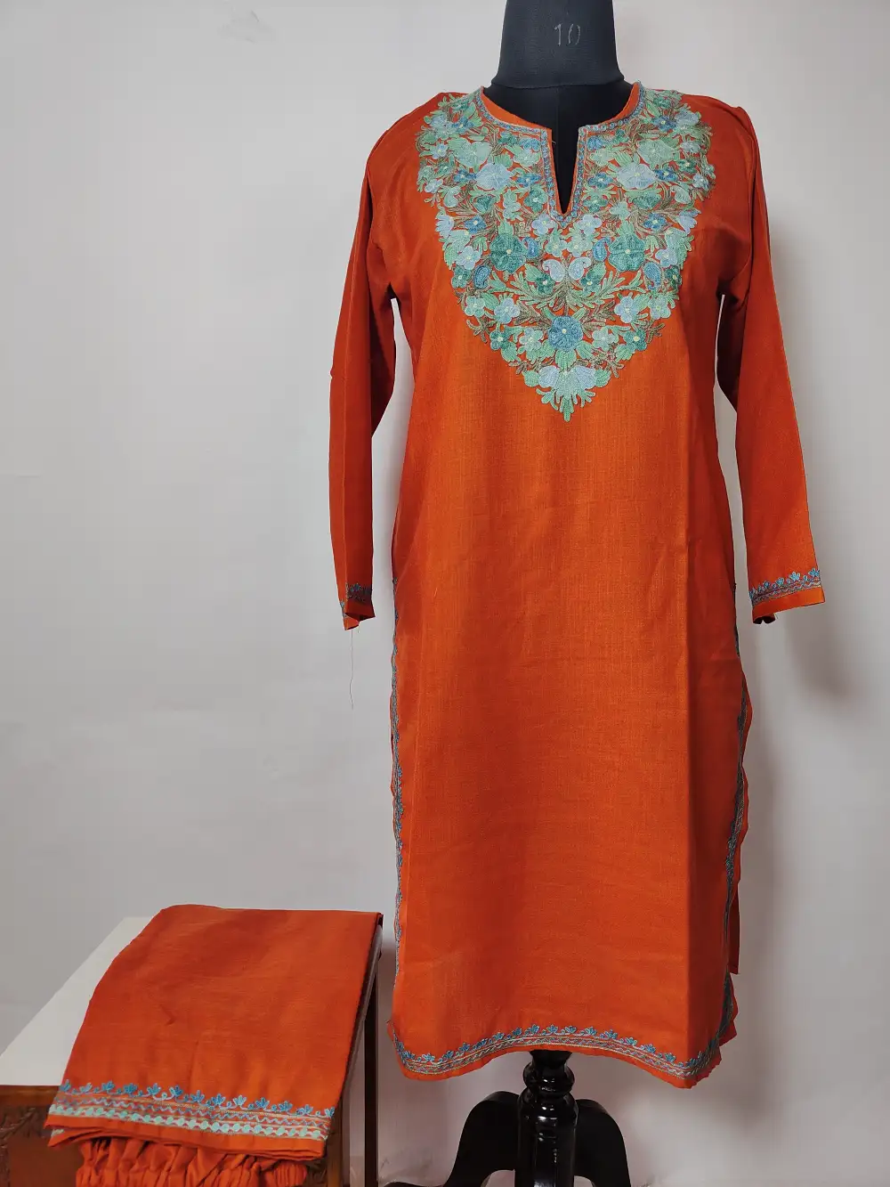 This rustic orange kurti set in ruby cotton offers everyday comfort with a graceful finish. The neckline featuresblue floral motifs in Aari embroidery, enhancing its elegance. With both the kurti and bottom included, it forms a complete outfit ready to wear. This breathable fabric and light structure makes it suitable for all-day use. It is a simple yet timeless choice for women who prefer balanced style.