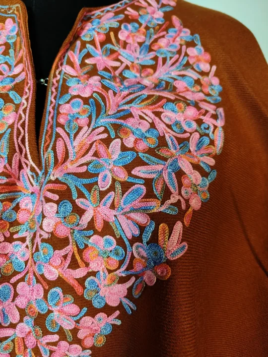 Prepared in cashmilon wool with lining support, this ponchu is presented in rustic orange colour. It highlights aari embroidery with floral design around neckline and border.