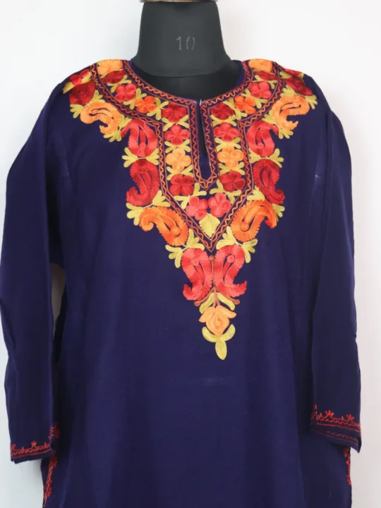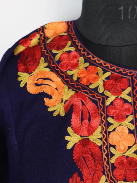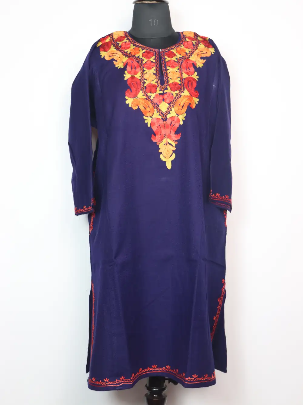 Designed using cashmilon wool to retain warmth, this stylish Kashmiri feran appears in dark blue colour. It highlights aari embroidery with floral detailing at neckline.