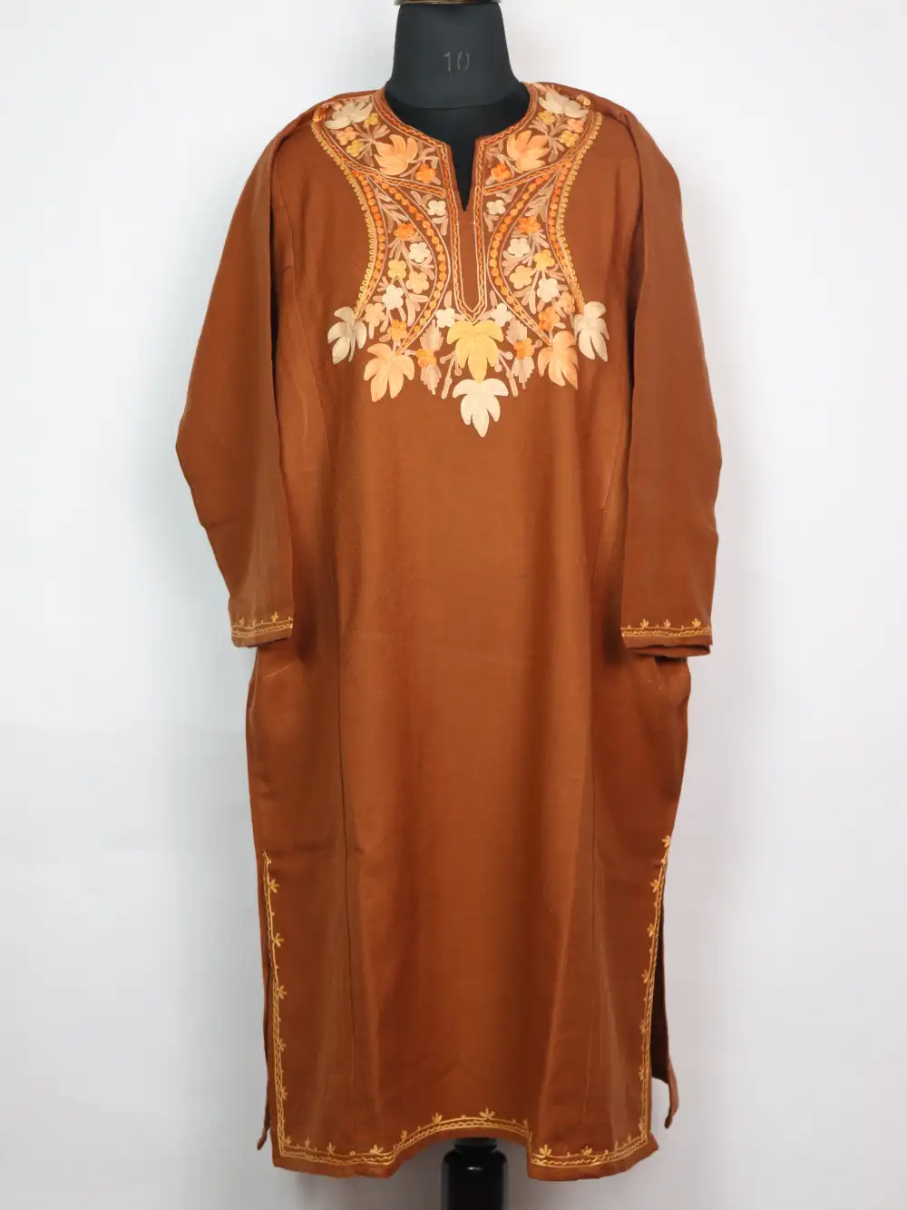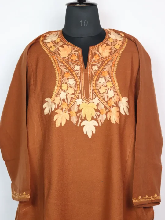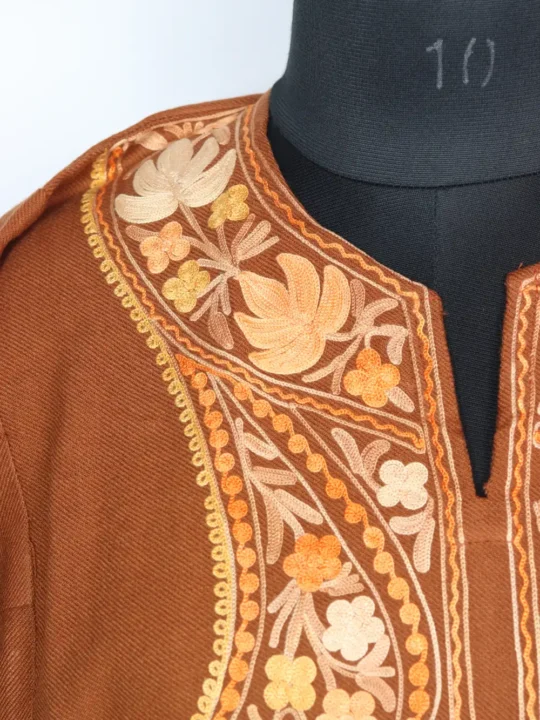 A roomy, brown stylish Kashmiri pheran made from Cashmilon wool—enhanced with floral Aari work at the neckline. It offers instant polish to everyday wear. It has functional pockets on both sides which add utility while the Pheran’s soft finish keeps comfort intact.
