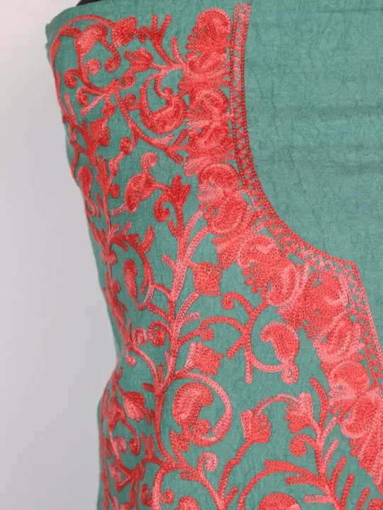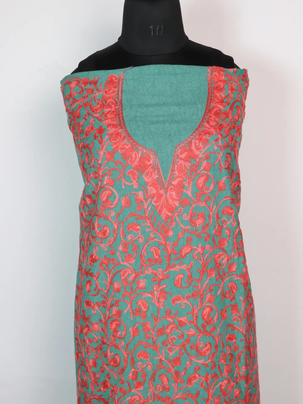 Soft crush cotton falls gently with a light structure in this sea green 2pc Suit, this fabric is breathable and easy to style. Jaal Aari embroidery runs all over in red threads, forming vine floral and badam motifs that read delicate against the surface. As it is unstitched material, the 2pc kapas Suit offers freedom to stitch it to your own fit, with the embroidery outlined neatly across body. It is a natural pick for those who are searching Kashmiri cotton stitched suits online.