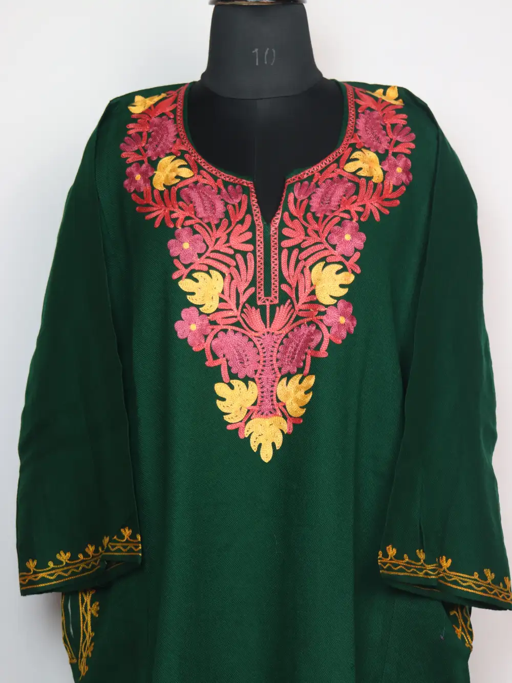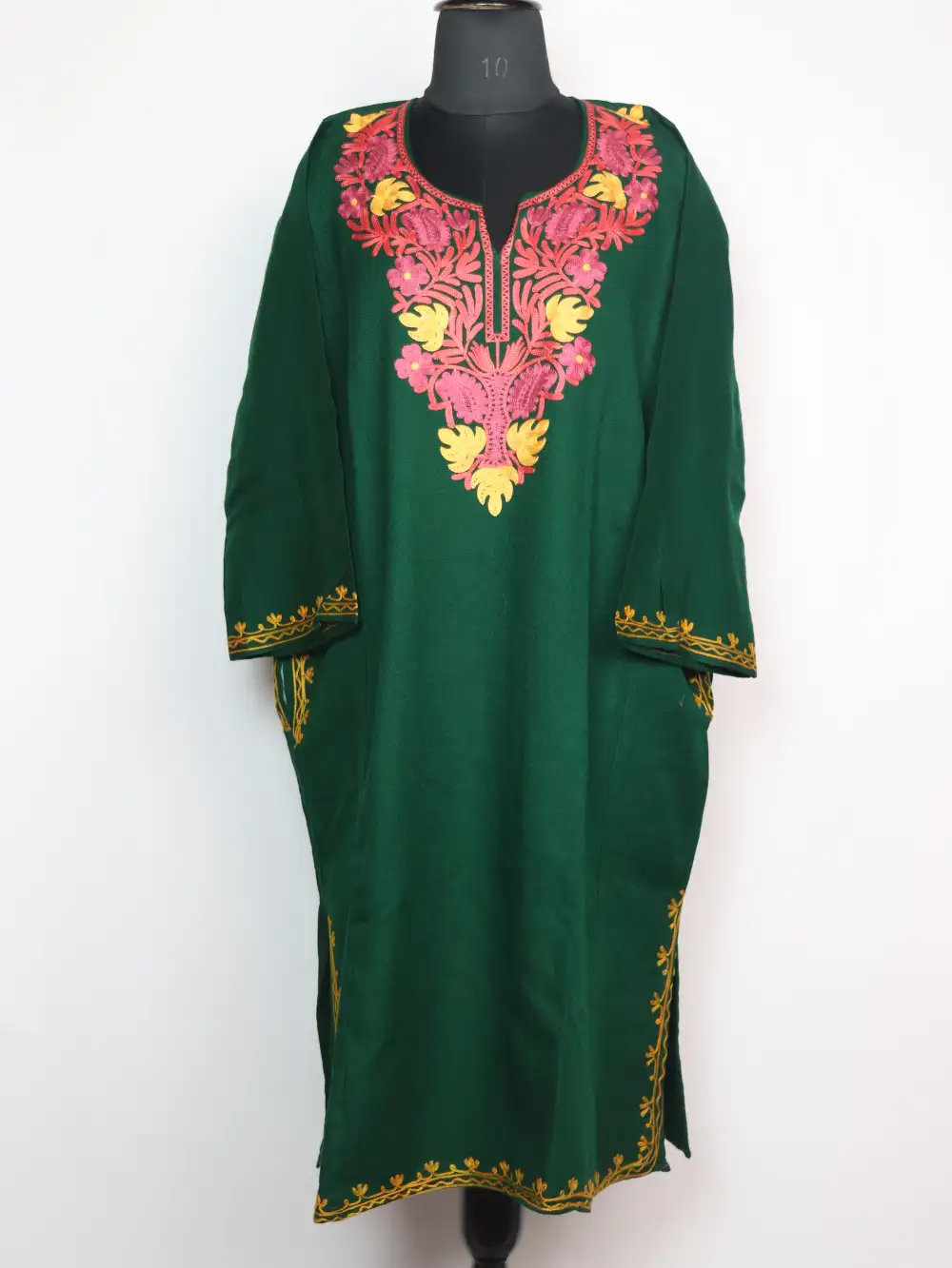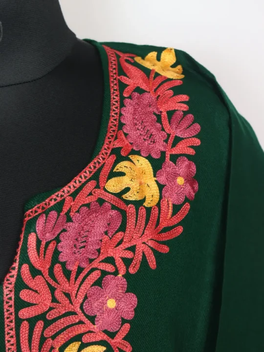 A Kashmiri feran in green colour woven in cashmilon, beautified with floral and chinar aari embroidery near the neckline. Its oth-side pockets add ease.