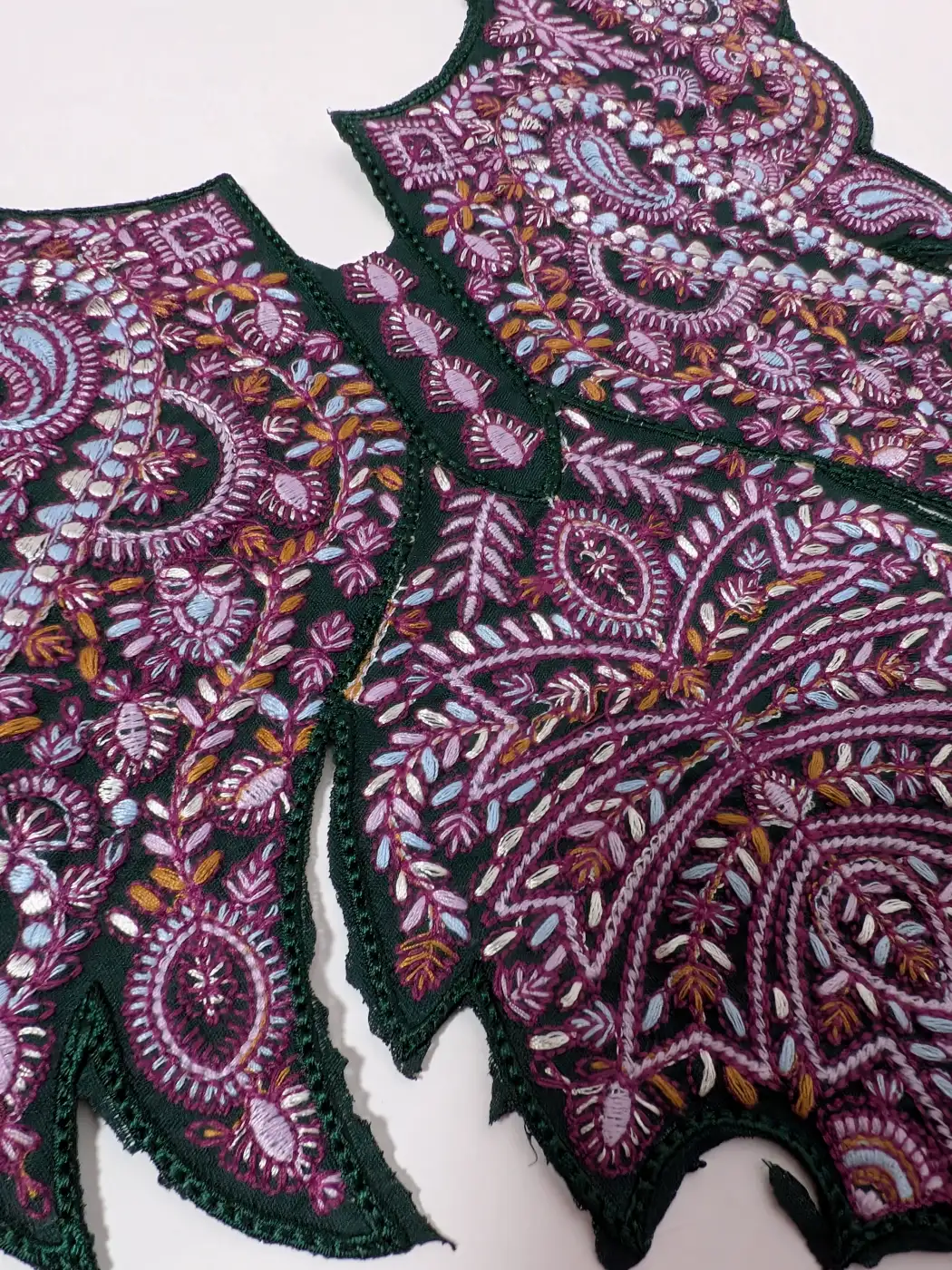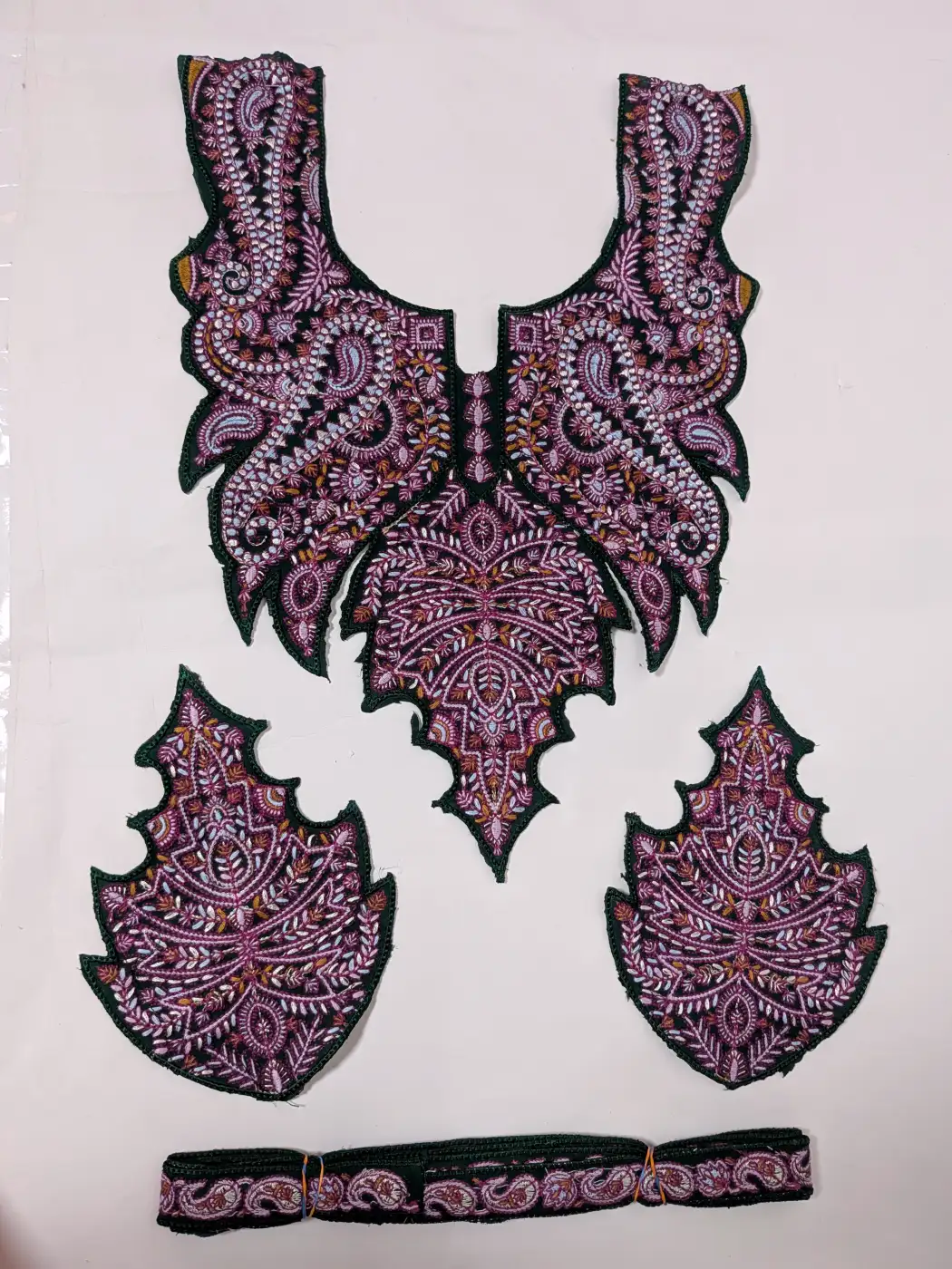 A dark green base supports this patch set, where floral and badam tilla embroidery enhances this chinar shaped neck patch and sleeve patches. The lace is finished with continuous patterns, brings all elements together in a design that feels rooted in traditional aesthetics.