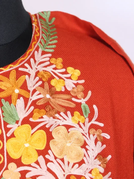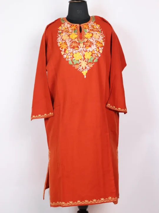 Crafted in soft cashmilon wool, this orange color pheran highlights beauty in aari work which is done on it. The neckline carries mustard and brown floral and green leaf along with light shade of pink vine patterns, adds an elegant accent to the outfit. It has been designed for women, it provides both comfort and a gentle touch of style, makes it suitable for daily wear. It is a versatile winter garment, it ensures warmth while giving a graceful charm to seasonal dressing.