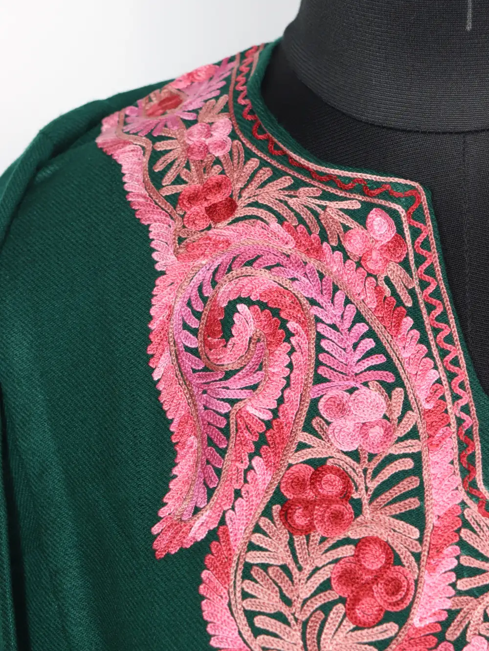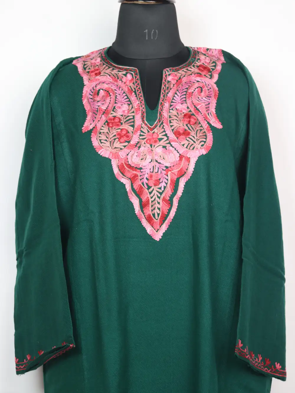 Crafted in Cashmilon wool for cosy warmth, this green colour pheran offers refined comfort and a relaxed fall with its 53 inch chest size and 42 inch length. It has been adorned with Aari work at neckline in floral badam motifs and it features pockets on both sides for convenience.