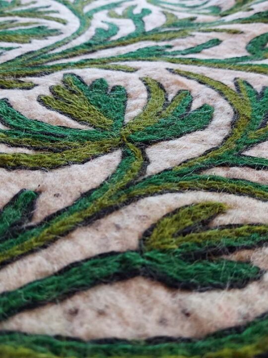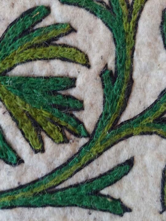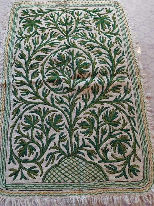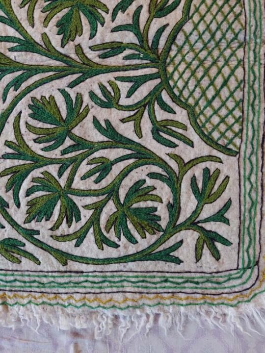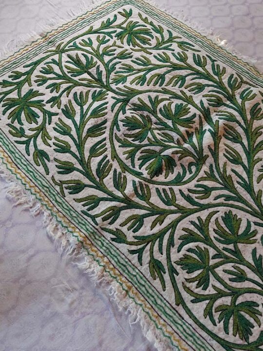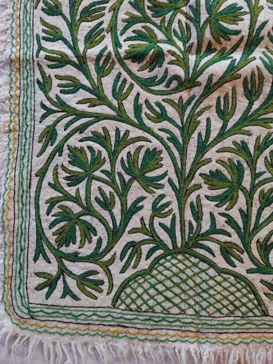 This beautiful white base with green work Namda rug has dimensions 6ftx4ft. It is made of sheep wool and embroidery is done by hand on it.